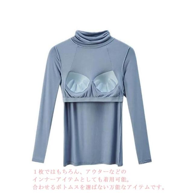 カップ付き Tシャツ レディース カップ付きインナー カップ付きカットソー タートルネック ハイネック 長袖Tシャツ 無地 肌着 ブラトップ 部屋着 ストレッチ 伸縮性 締め付けない シンプル 女性 春 秋 冬 大きいサイズ 送料無料