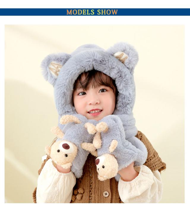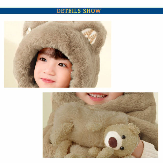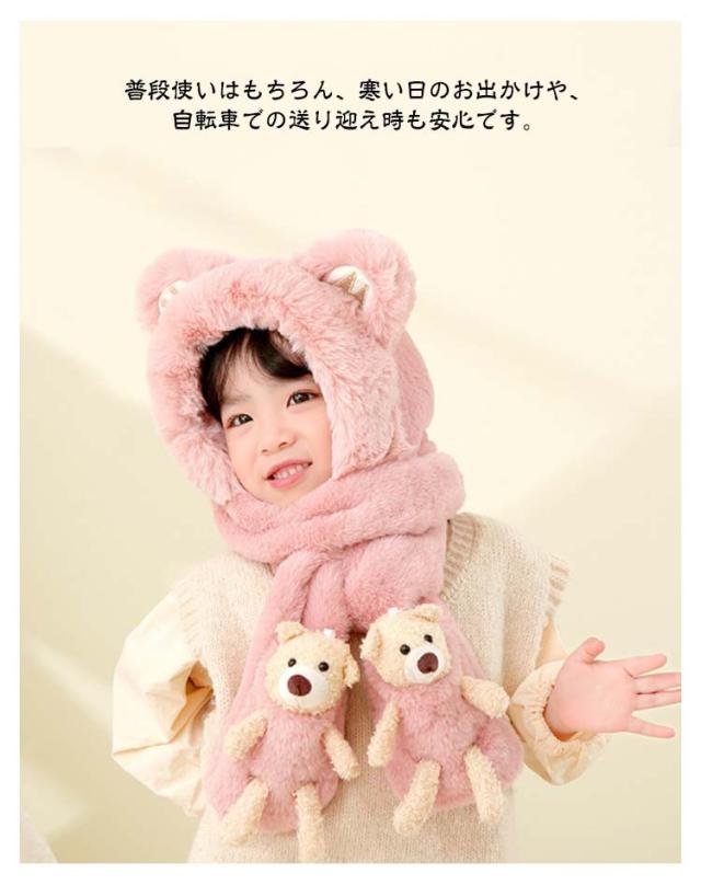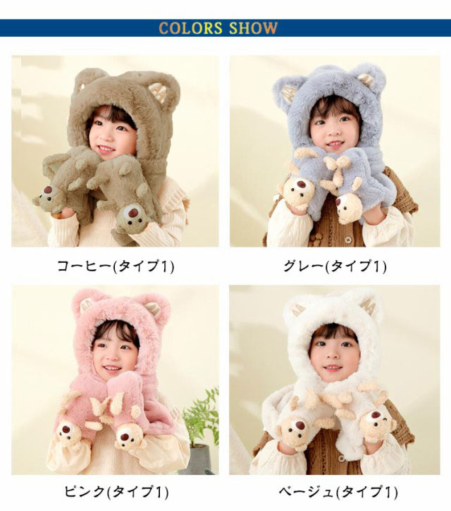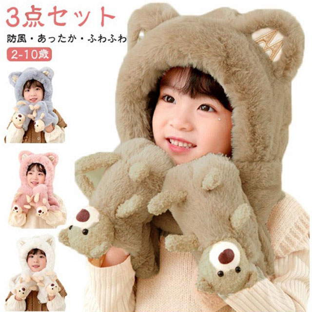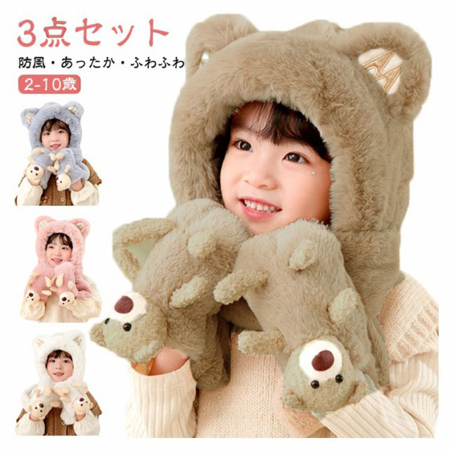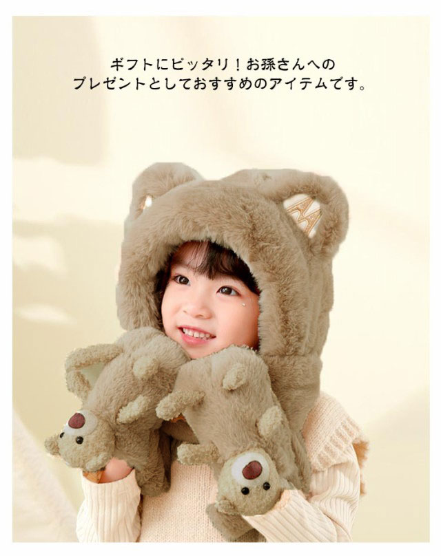 | 【3点セット】【防風・あったか・ふわふわ】【2-10歳】 フワモコのフリースで、柔らかくてとても暖かいです。ぬいぐるみ付きでとても可愛いです。 クマ耳が付いていてとってもキュート!かぶるとかわいい動物に大変身♪ グローブ+マフラー一体型帽子なので、頭〜首元〜手までしっかりあったか。 普段使いはもちろん、寒い日のお出かけや、自転車での送り迎え時も安心です。 ギフトにピッタリ!お孫さんへのプレゼントとしておすすめのアイテムです。 | |