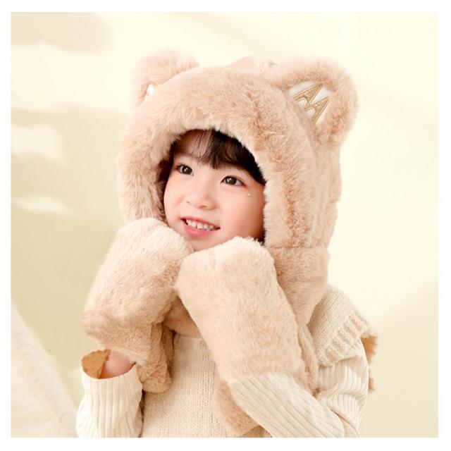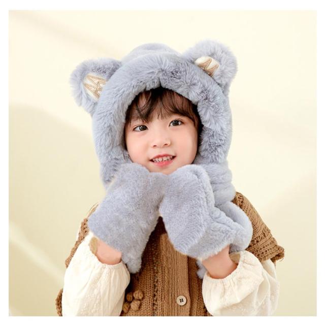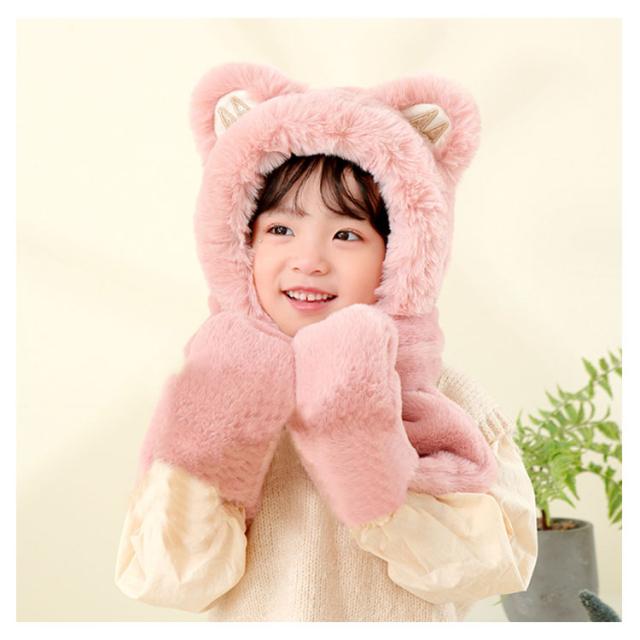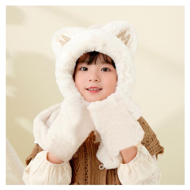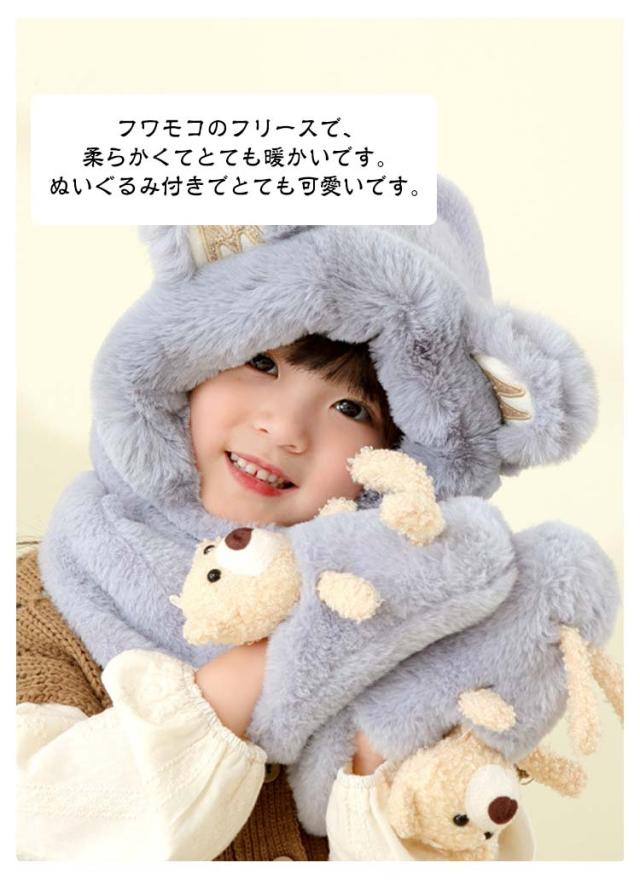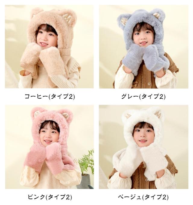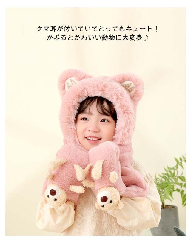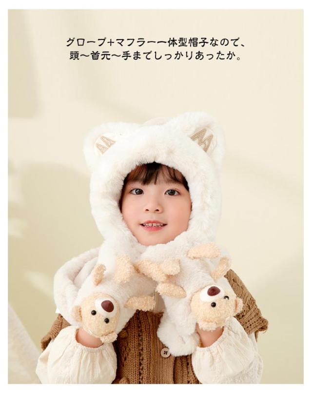 【3 in 1】キッズ マフラー 手袋 一体型帽子 ベビー 防寒 被り物 耳付き帽子 女の子 男の子 子供 ふわふわ もこもこ 冬 ネックウォーマー フードウォーマー ミトン グローブ 子ども かわいい おしゃれ 幼稚園 保育園 雪遊び