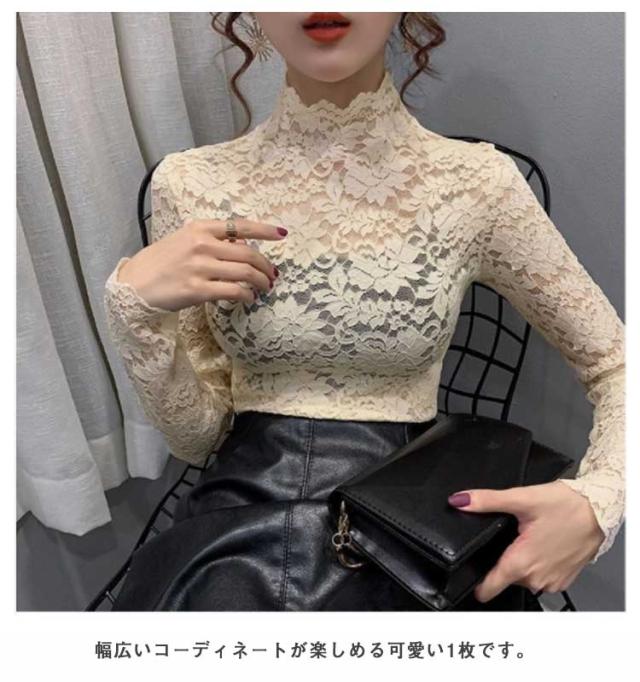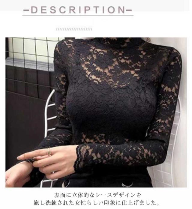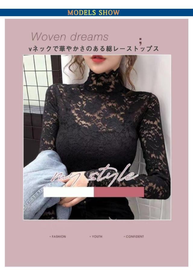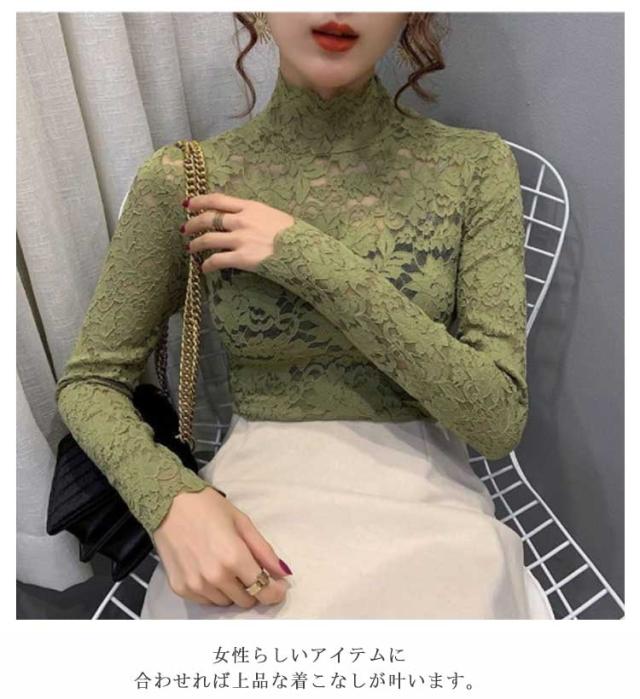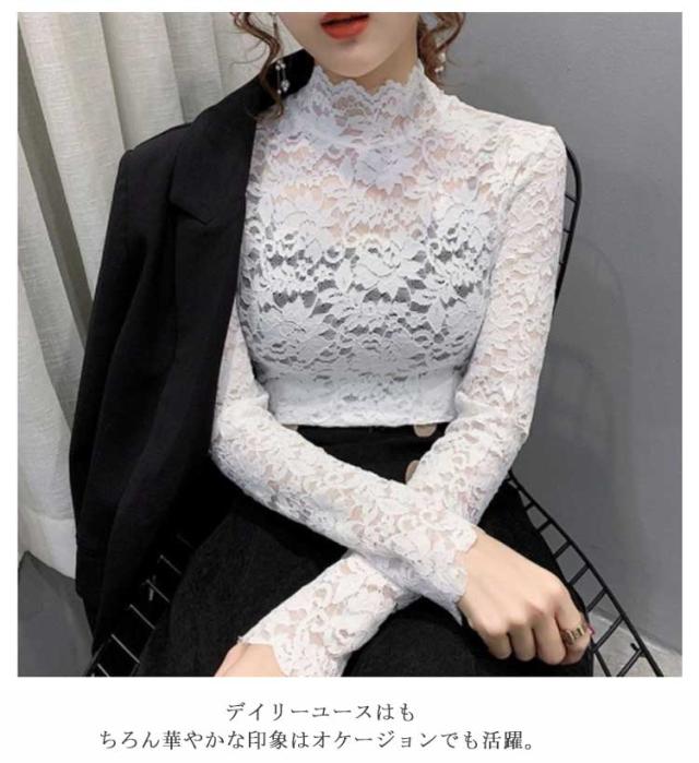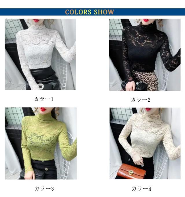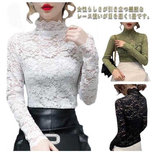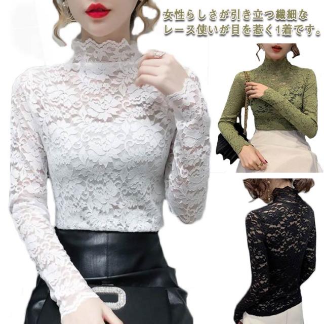 レーストップス レディース 透け感 シアー トップス レイヤード風 春服 秋服 ハイネック インナーシャツ インナー 長袖 重ね着 きれいめ 花柄 フラワーレース S M L XL 2XL 3XL 4XL 5XL