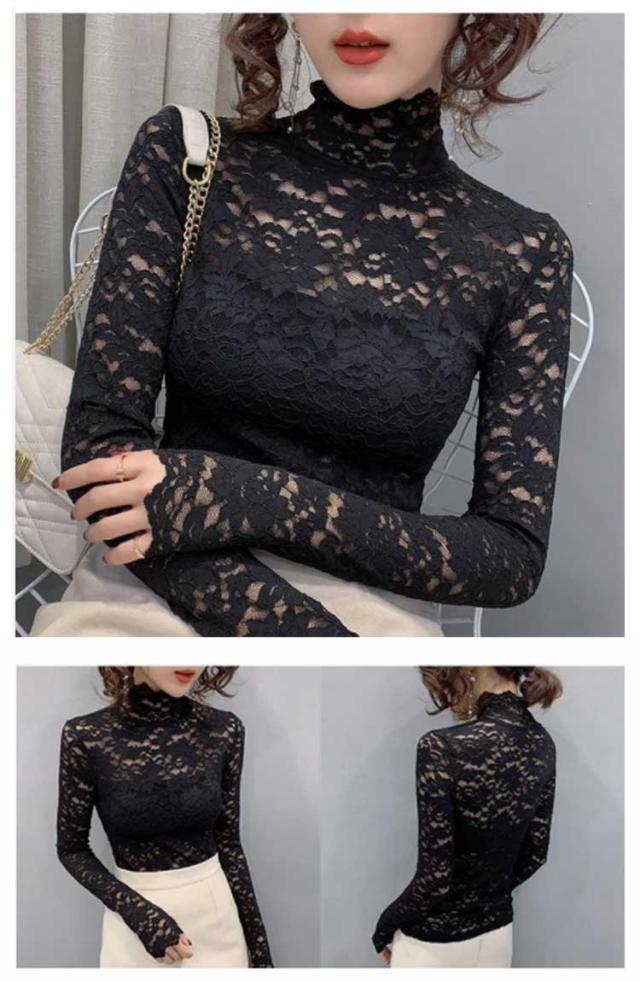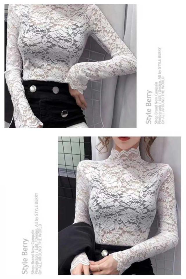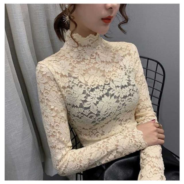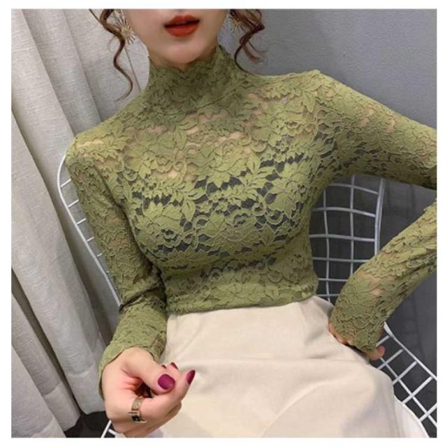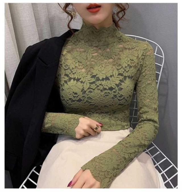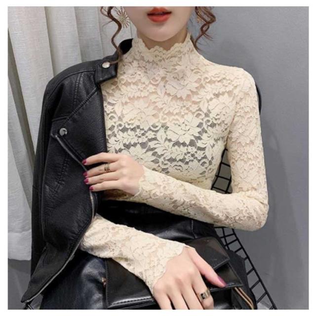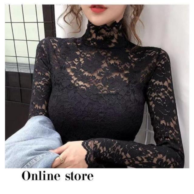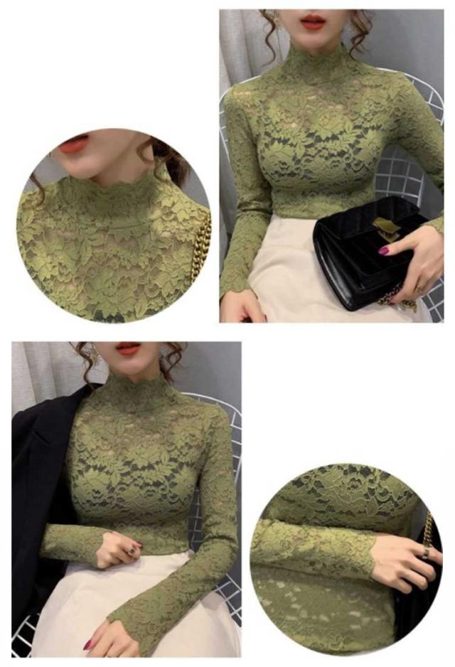 レーストップス レディース 透け感 シアー トップス レイヤード風 春服 秋服 ハイネック インナーシャツ インナー 長袖 重ね着 きれいめ 花柄 フラワーレース S M L XL 2XL 3XL 4XL 5XL