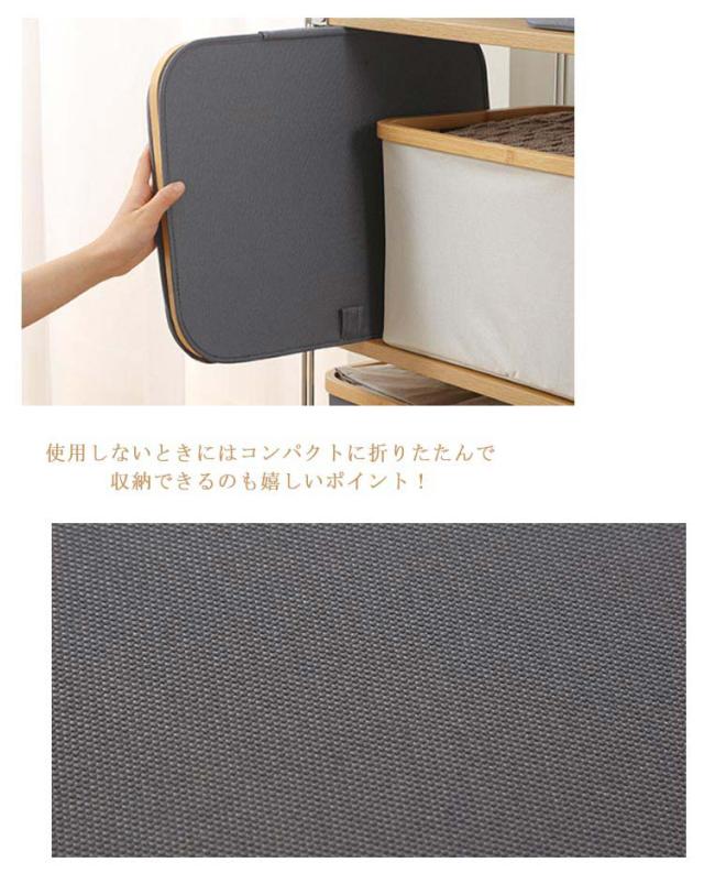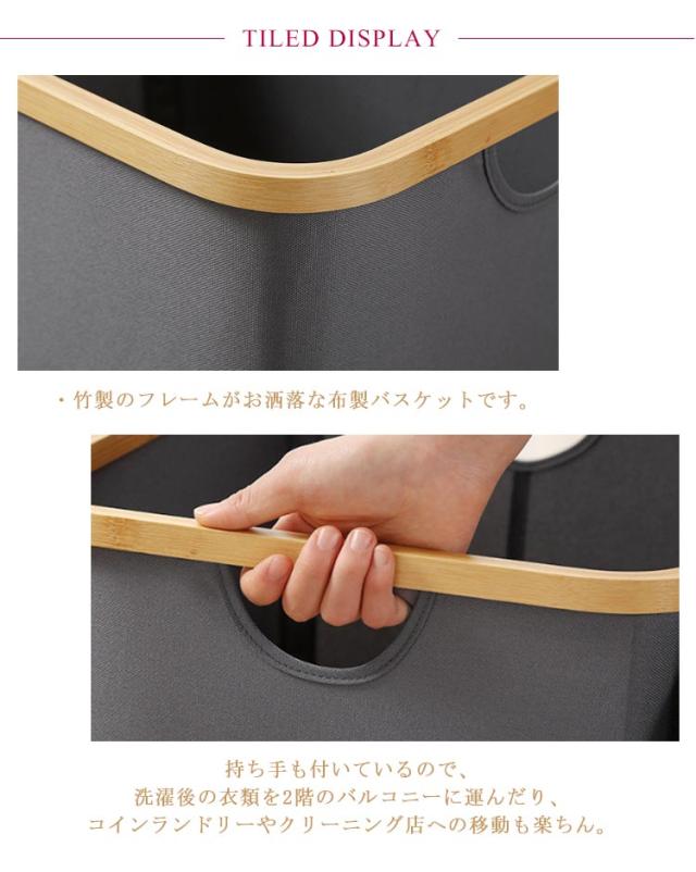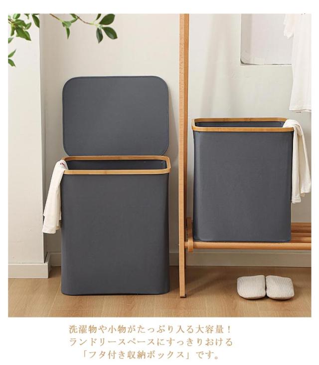 | ・生活感を隠してしっかり収納! ・竹製のフレームがお洒落な布製バスケットです。 ・洗濯物や小物がたっぷり入る大容量!ランドリースペースにすっきりおける「フタ付き収納ボックス」です。 ・内面は防水加工なので、湿った洗濯物にもお使いいただけます。 ・ランドリーバスケットとしてだけでなく、子ども部屋ではおもちゃ用収納ボックスなどに大活躍! ・持ち手も付いているので、洗濯後の衣類を2階のバルコニーに運んだり、コインランドリーやクリーニング店への移動も楽ちん。 ・使用しないときにはコンパクトに折りたたんで収納できるのも嬉しいポイント! | |
