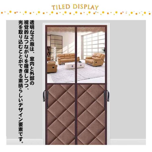 | 【透明な窓付き】間仕切りの保温&防寒&断熱ドアカーテン。 表面はPVC素材なので、雨や雪の漏れを効果的に遮断します。 中綿入りなので、冷風の侵入を防ぎ、部屋の温度も守ります。 マグネット式なので、自動的に開閉ことができます。 透明なPVC窓は、室内と外部の視覚的なつながりを確保しつつ、光を取り込むことができる素晴らしいデザイン要素です。 面倒な工事が不要、女性の方でも簡単に操作できます。 夏場はクーラーで冷えた空気を、冬場はストーブで暖まった空気を、 部屋の外に逃がさない磁石の力で閉まる間仕切りカーテンです。 | |