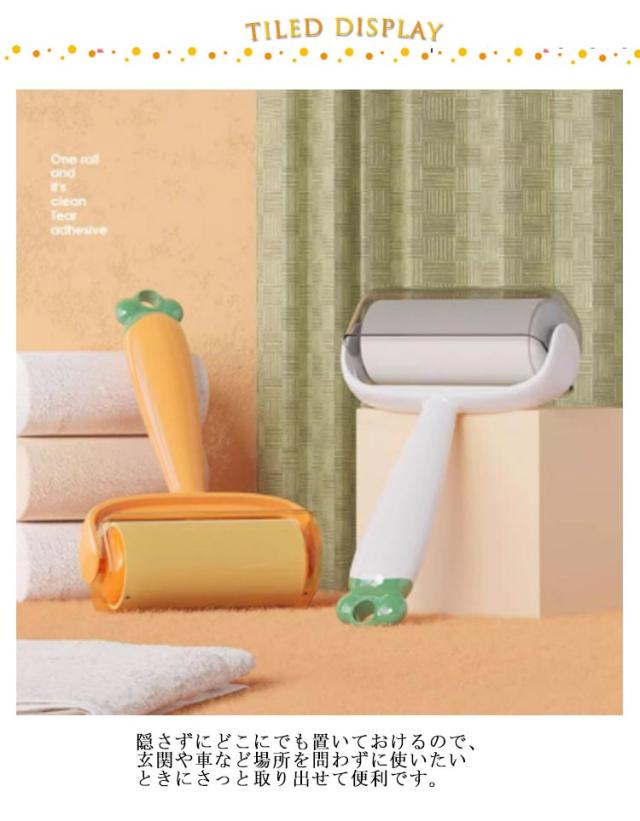 | 1枚のシートで一気にたくさんのゴミが取れる粘着クリーナー♪ とってもキュートな持ち手は、フックにかけたり、そのままインテリアとして飾っておいたり◎ 隠さずにどこにでも置いておけるので、玄関や車など場所を問わずに使いたいときにさっと取り出せて便利です。 洋服やカーペットのお掃除にはもちろん、ペットの毛が付いた時にもコロコロすればすっきりキレイ! スペアテープ(12本セット)もご用意しており、市販リフィルにも交換できます。 おしゃれなおそうじグッズで、気持ちよく過ごせそうですね。 | |