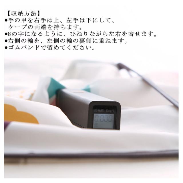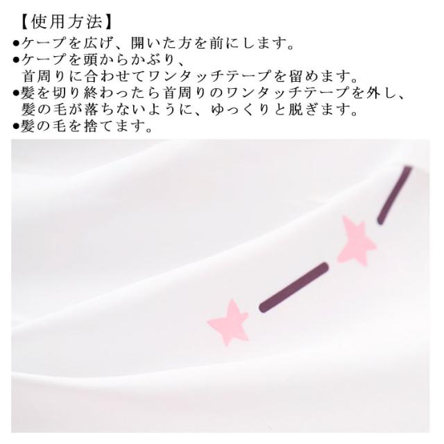 | おうちでのヘアカットに便利な散髪用ケープ。 すっぽりかぶって装着も簡単。 ワンタッチテープで首まわりを調節できるので、子供から大人まで使えます。 帯電防止加工で髪の毛が飛び散りにくく、後片付けもラクラク! カットした髪の毛はまとめて簡単にポイ! ねじってたたんでコンパクトに収納できます。 【使用方法】 ●ケープを広げ、開いた方を前にします。 ●ケープを頭からかぶり、首周りに合わせてワンタッチテープを留めます。 ●髪を切り終わったら首周りのワンタッチテープを外し、髪の毛が落ちないように、ゆっくりと脱ぎます。 ●髪の毛を捨てます。 【収納方法】 ●手の甲を右手は上、左手は下にして、ケープの両端を持ちます。 ●8の字になるように、ひねりながら左右を寄せます。 ●右側の輪を、左側の輪の裏側に重ねます。 ●ゴムバンドで留めてください。 | |