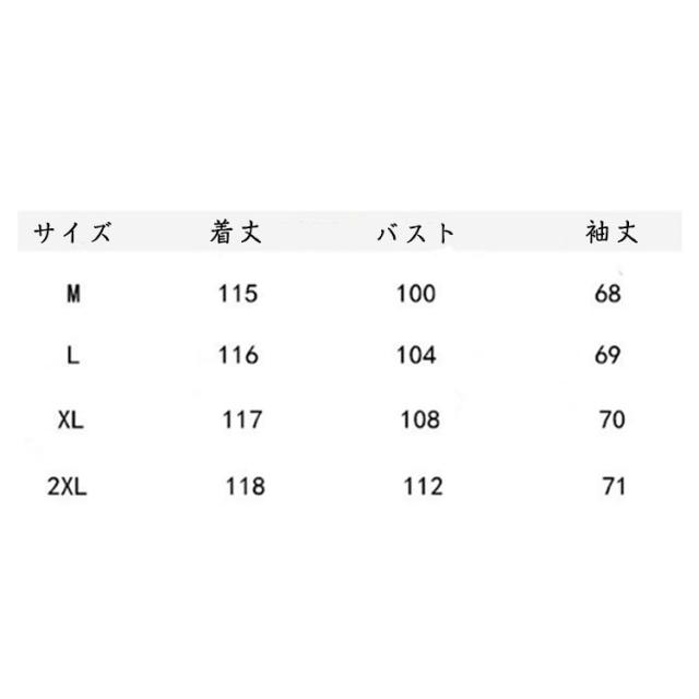 | サイズについての説明 | M:着丈115cm バスト100cm 袖丈68cm ?:着丈116cm バスト104cm 袖丈69cm XL:着丈117cm バスト108cm 袖丈70cm 2XL:着丈118cm バスト112cm 袖丈71cm ※サイズ表の実寸法は商品によって1-3cm程度の誤差がある場合がございます。 |