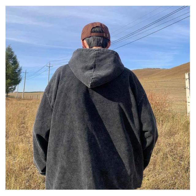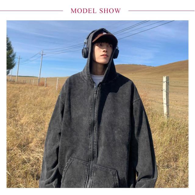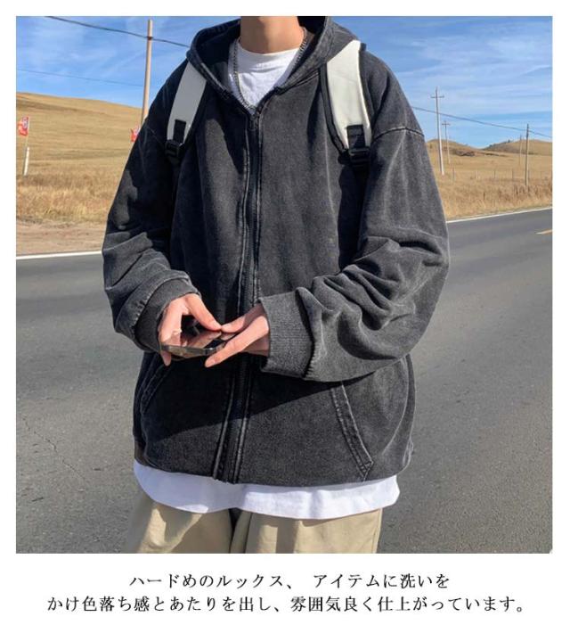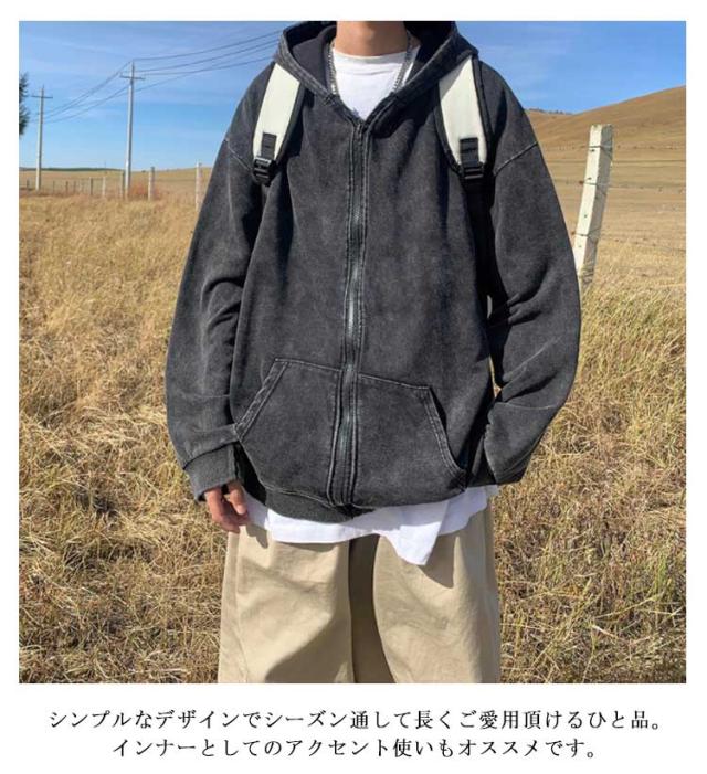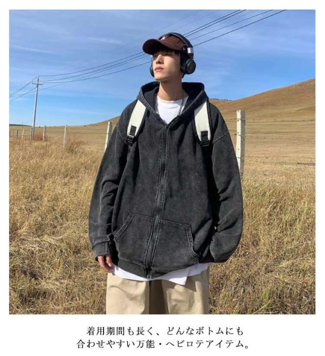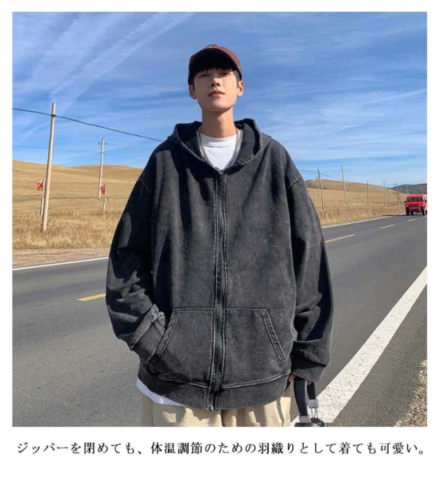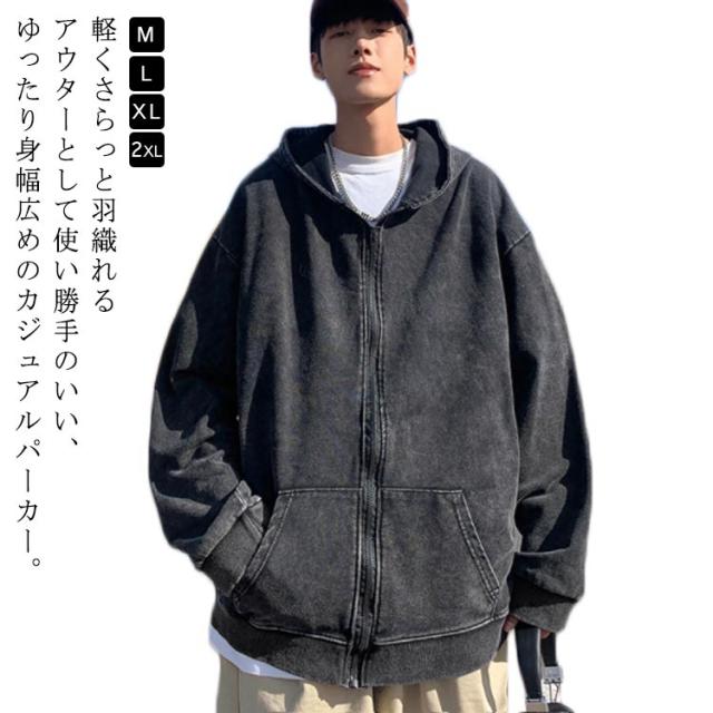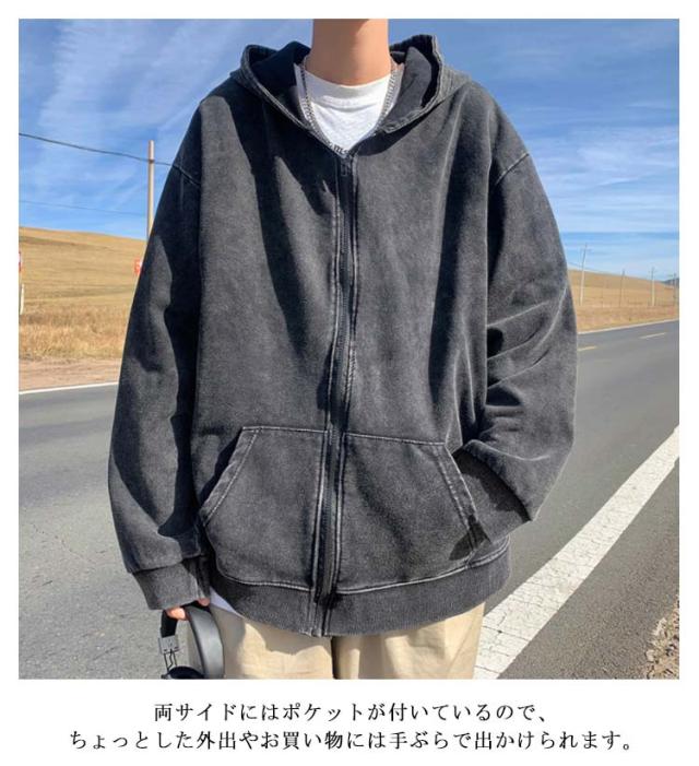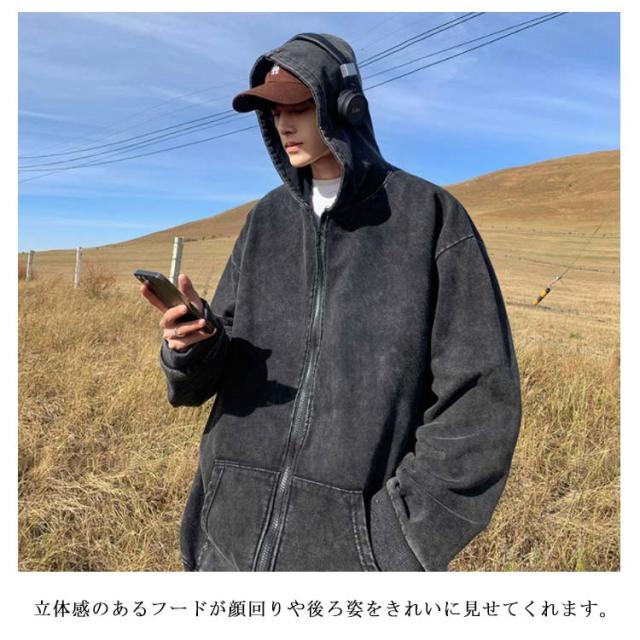 ウォッシュ加工 お洒落 ジップパーカー メンズ フード 前開き ジップ アウター 上着 長袖 コート カーディガン パーカー スウェット ぶかぶか ゆったり 大きめ 大きい オーバーサイズ インディゴ染め ストレッチ カジュアル