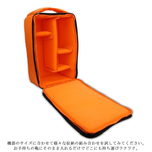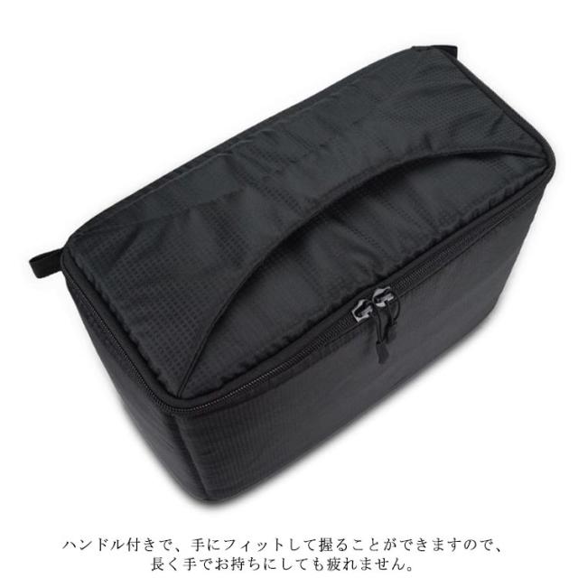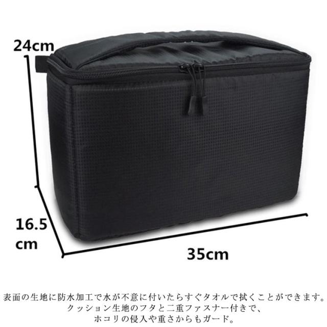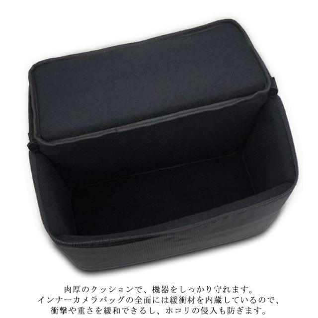 | ミラーレス&一眼レフカメラを収納できるインナーカメラバッグです。いつもの鞄をカメラバッグとして使用することができるようになります。 カメラ本体だけでなく、レンズもストロボ一緒にたっぷり収納することができます。 機器のサイズに合わせて様々な収納の組み合わせを試してみてください。 お手持ちの鞄にそのまま入れるだけでどこにも持ち運びラクラク。 カメラをインナーカメラバッグといつものカバンの二重でしっかり保護でき、落下防止対応、安心! 肉厚のクッションで、機器をしっかり守れます。 インナーカメラバッグの全面には緩衝材を内蔵しているので、衝撃や重さを緩和できるし、ホコリの侵入も防ぎます。 仕切り付でカメラに合わせて微調節可能!仕切り板付で収納機器のサイズに合わせてバッグ内で機器が動かないように調整できます。 表面の生地に防水加工で水が不意に付いたらすぐタオルで拭くことができます。 クッション生地のフタと二重ファスナー付きで、ホコリの侵入や重さからもガード。 肉厚のクッション生地のフタ付きなので、ホコリの侵入や上から衝撃、重さも緩和します。 ハンドル付きで、手にフィットして握ることができますので、長く手でお持ちにしても疲れません。 | |
