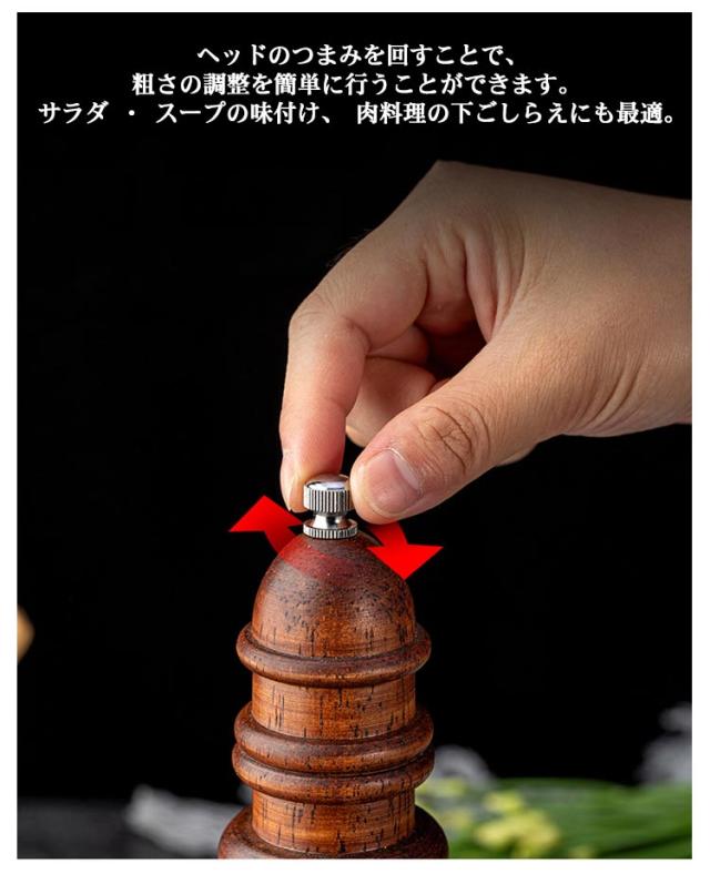 | ソルト・ペッパー・クミン・山椒などのスパイスが手軽に挽けるミルです ヘッドのつまみを回すことで、粗さの調整を簡単に行うことができます。 サラダ ・ スープの味付け、 肉料理の下ごしらえにも最適。 硬くて丈夫で切れ味のいいセラミック製の刃を使用。 錆の心配もなく塩 ・ 胡椒の香りを保ちやすいので良い風味が楽しめます。 透明なので中身の量が一目瞭然です。 天然木の風合いを活かしたデザイン。インテリアにも馴染みやすく、食卓をおしゃれな雰囲気にしてくれます。 | |