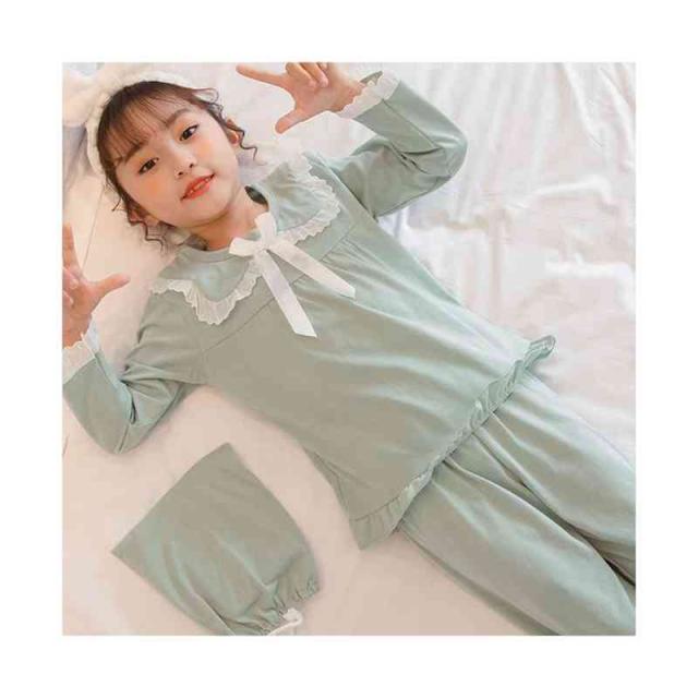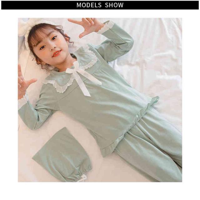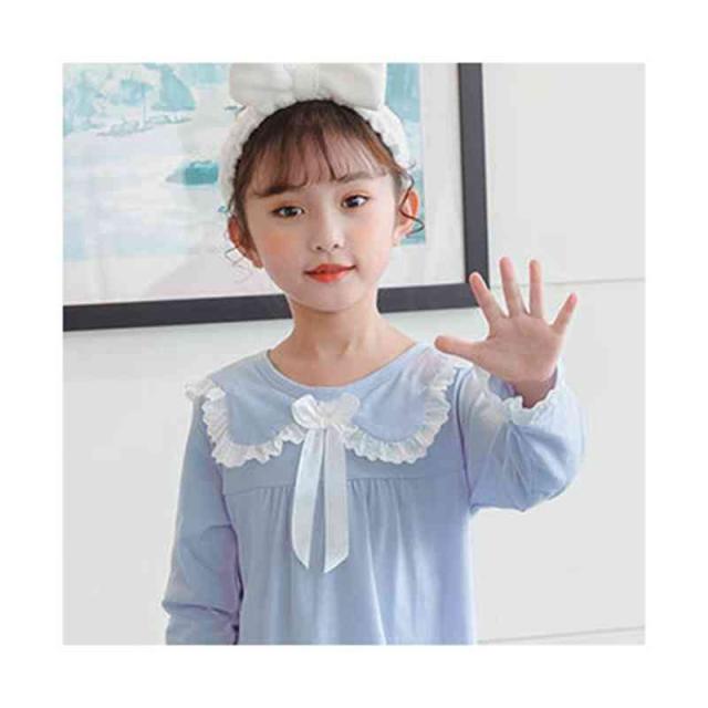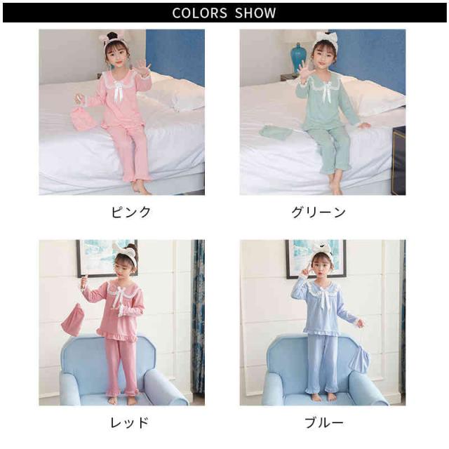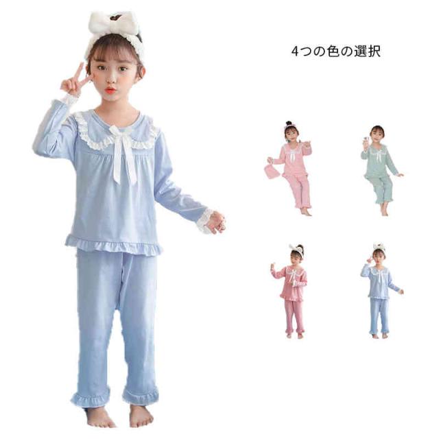 リボンパジャマ 折襟 レースパジャマ キッズ 春秋 上下セット 二点セット セットアップ ルームパジャマ 長袖 レース付き 部屋着 寝巻き パジャマ 子供服 フリルパジャマ 女の子 ルームウエア 送料無料 ロングパンツ 無地 シンプル カジュアル おしゃれ