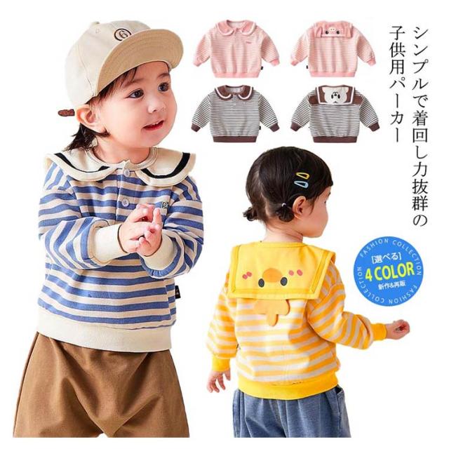 長袖tシャツ パーカー キッズ 子供服 長袖 トップス トレーナー 春秋 ストライプ スウェット 折り襟 動物柄 送料無料 可愛い プルオーバー ゆったり ジュニア 小学生 中学生 幼稚園 通園 通学