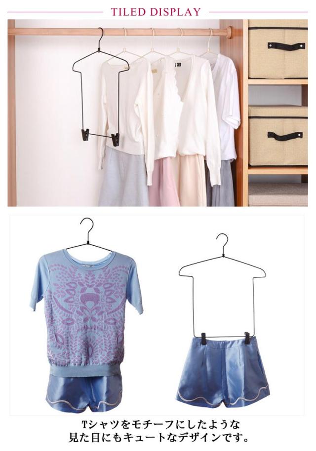 | トップスとボトムスを一緒に収納できるセットアップ用ハンガーです。 Tシャツをモチーフにしたような見た目にもキュートなデザインです。 ジャケットとボトムスを合わせてかけられるのでスーツなどのセットアップにオススメです。 またお気に入りのコーディネートで収納すれば忙しい朝に迷わずさっと選べるので便利です。 収納しやすいワイヤータイプで省スペースです。 | |