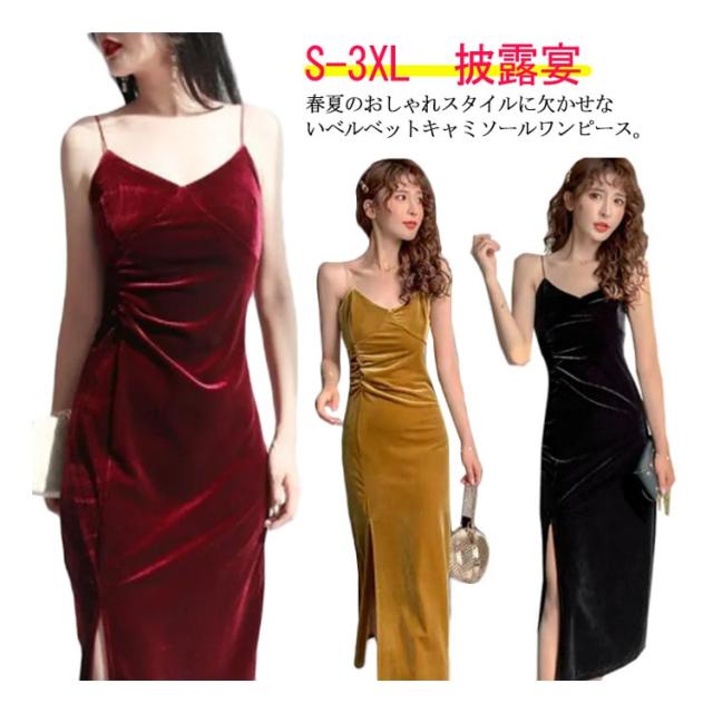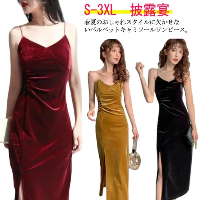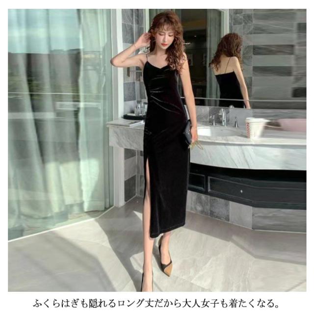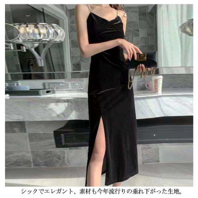パーティードレス ベルベットワンピース スリップ ワンピース キャミワンピ キャミワンピース ベルベット キャミソールワンピース ロング丈 タイト 深めスリット インナー ドレス 春夏 おしゃれ ビロード ロングドレス 披露宴 送料無料