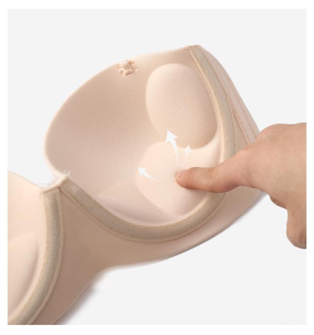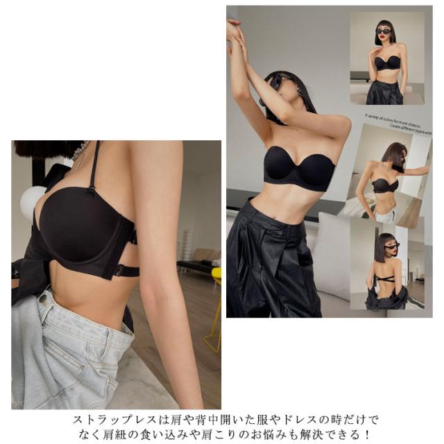 | 着ける瞬間に谷間アップ!トラップレスブラ。 肩や胸元のあいたドレスに絶対おすすめ! ストラップレスなのでサイドホックで美乳をメイク。 ワイヤー入り&立体カップで綺麗なシルエットに。 カップ部分は柔らか素材で通気性があり汗ばむ季節も快適♪ 2重のバックベルトでホールドアップ!シリコンサイドも付いているので、背中開いた服を着る際にぜひおすすめです。 ストラップレスは肩や背中開いた服やドレスの時だけでなく肩紐の食い込みや肩こりのお悩みも解決できる! 首紐もついているので、いろんなシーンにも合わせる! ドレススタイルの他、オフショルや夏のファッションにも大活躍間違いなし! | |