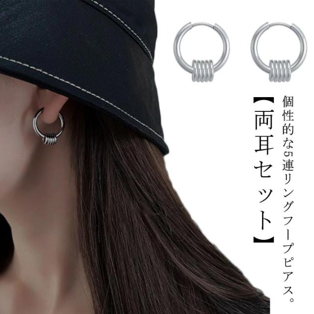 | 個性的な5連リングフープピアス。【両耳セット】 大きすぎない程よいサイズ感なので、誰でもつけやすくコーデのアクセントにおすすめです。 シングルピアスとして片耳だけにつけたり、両耳につけたりその日の気分で使い分けできます。 カップルやお友達同士でシェアすると更にお得です。 シンプルなフープピアスはメンズにもレディースにもおススメです。 | |