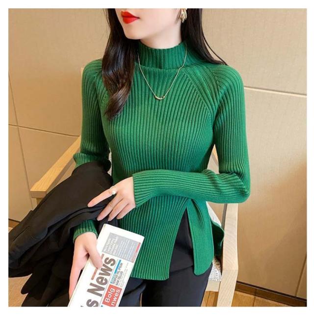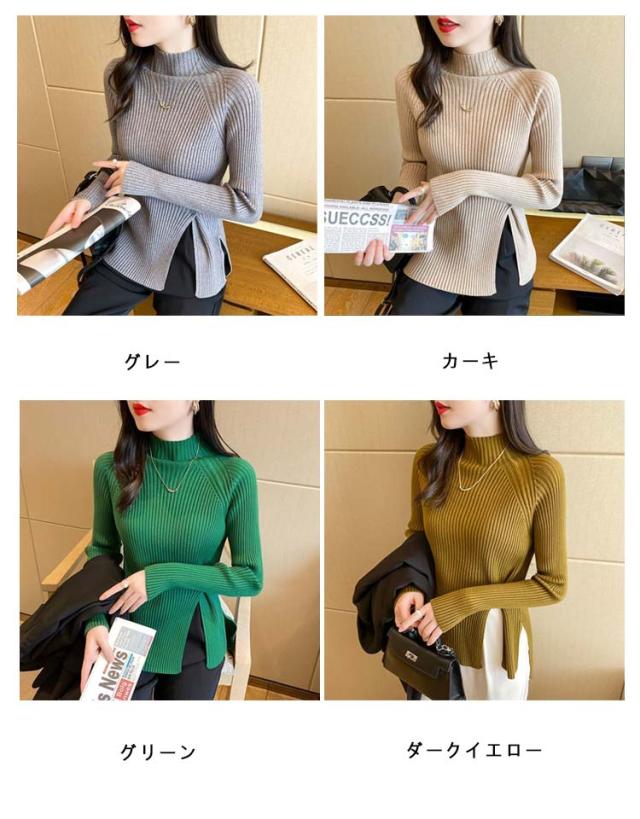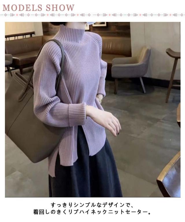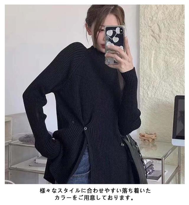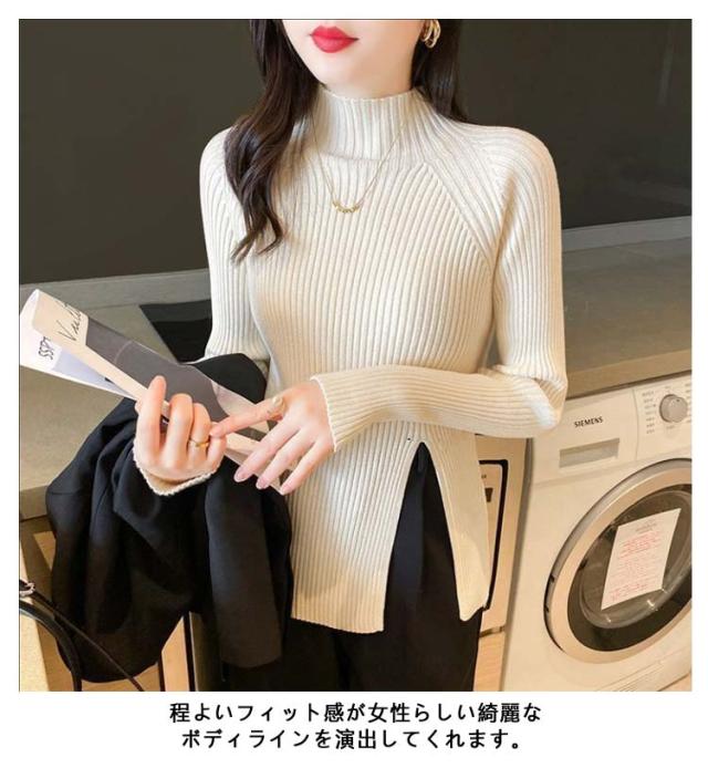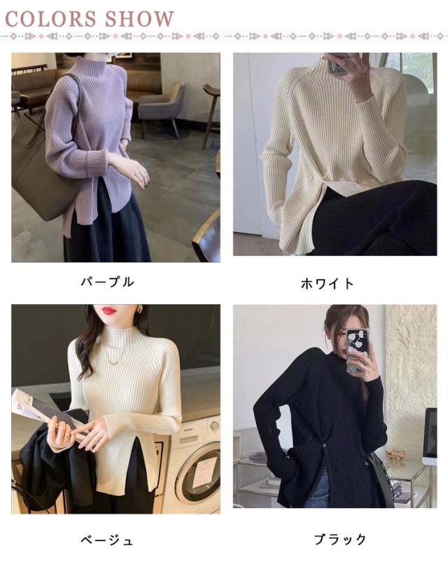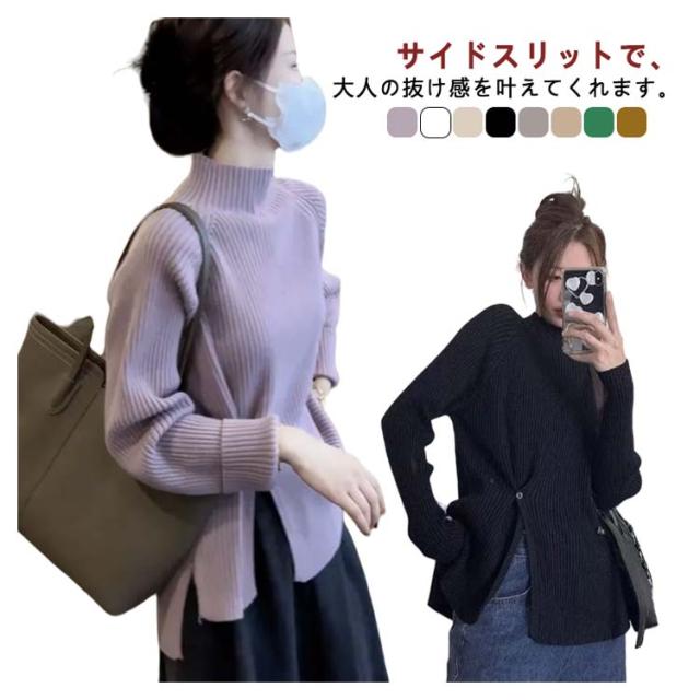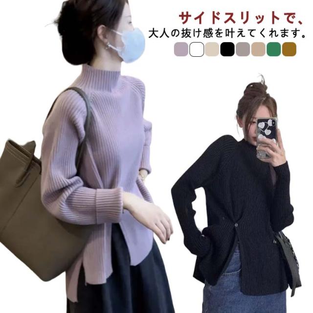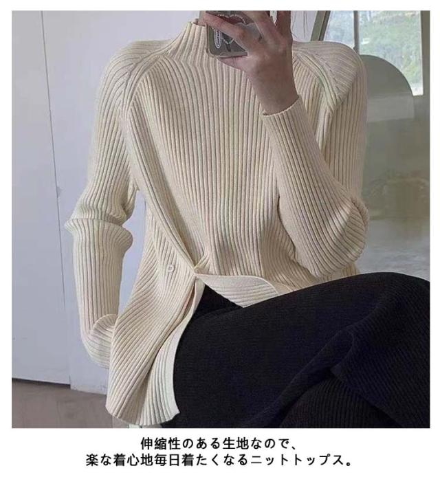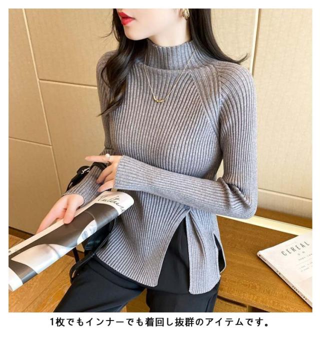 ニットセーター 長袖 レディース 秋冬 リブニット ハイネック タートルネック チュニック セーター インナー ウエストボタン 調整可 サイドスリット レイヤード お洒落 コーデ 重ね着 ニットトップス きれいめ 着?せ 無地
