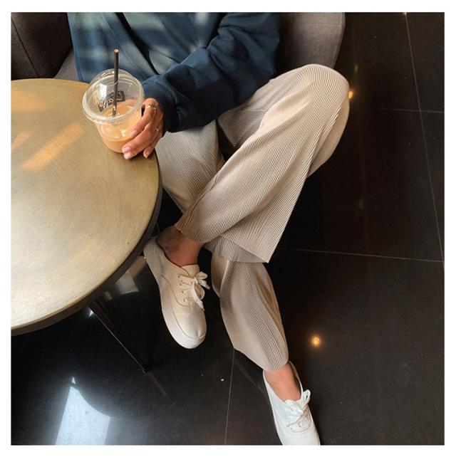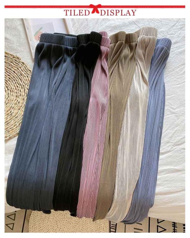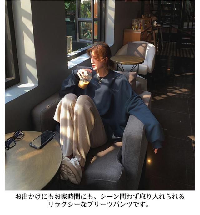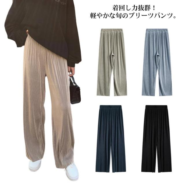 パンツ プリーツパンツ ワイドパンツ ルーズ レディース ボトムス 春 夏 秋 ウエストゴム シンプル 無地 光沢感 縦ライン 高見え ストレートパンツ イージーパンツ ゆったり カジュアル 送料無料