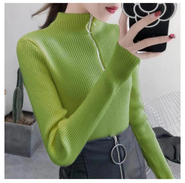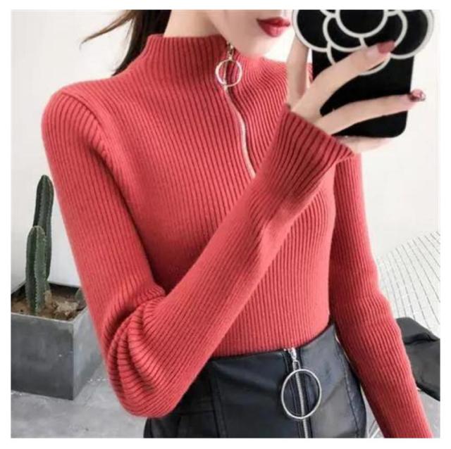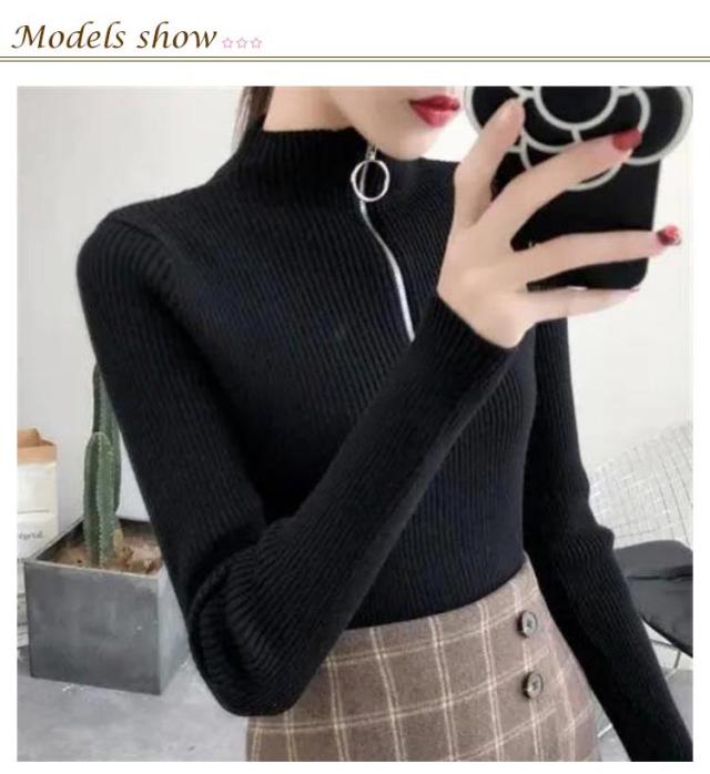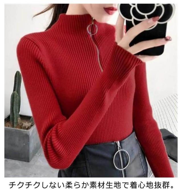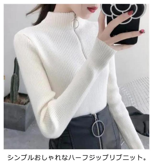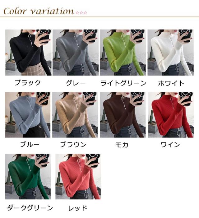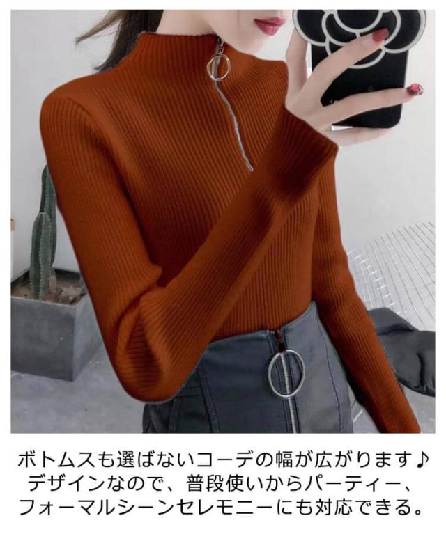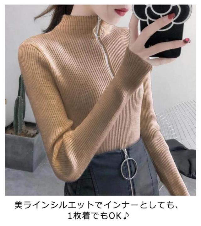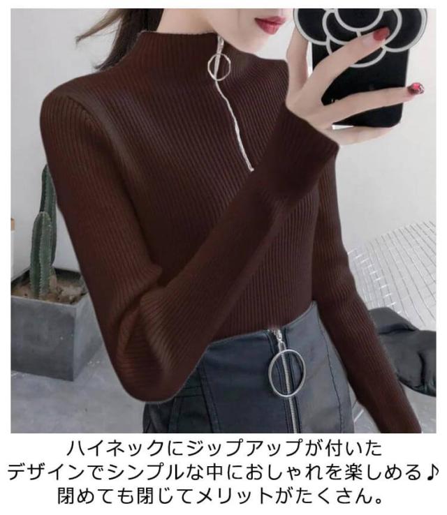 ハイネック ファスナー ニット セーター レディース トップス インナー 長袖 タートルネック リブ編み リブニット リブニットセーター ジッパー 重ね着 ストレッチ 秋 冬 秋冬 カジュアル フェミニン オフィス OL 上品 大人 無地 春 白 黒 着痩せ