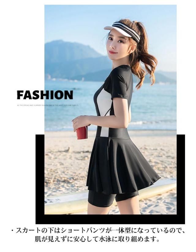 フィットネス水着 レディース 上下セット 一体型 オールインワン ショートパンツ 半袖ワンピース ノンワイヤー パッド付き ストレッチ 露出控えめ ママ水着 体型カバー 女性用 おしゃれ かわいい 全2色