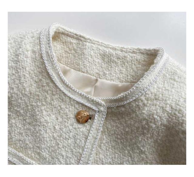 | 高級感あふれるマットなツイード素材が特徴のノーカラージャケット。 首元は優しいスタンドカラーになったジャケットは、首周りをキレイに魅せます。フロント前ボタンは開閉して機能的に着用でき、シンプルなデザインのアクセントにもなっています。 合わせやすい絶妙な着丈で、パンツスタイルと合わせるのが一番ですが、スカートなどあらゆるボトムスとの相性も良いです。 卒業、入学用としてはもちろん、お仕事着から冠婚葬祭まで幅広いシーンで着用いただける万能ジャケットです。 | |