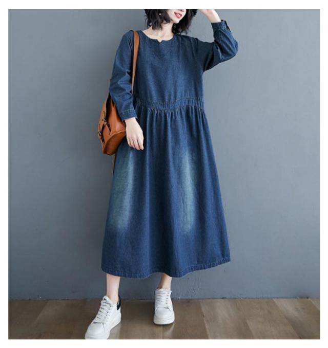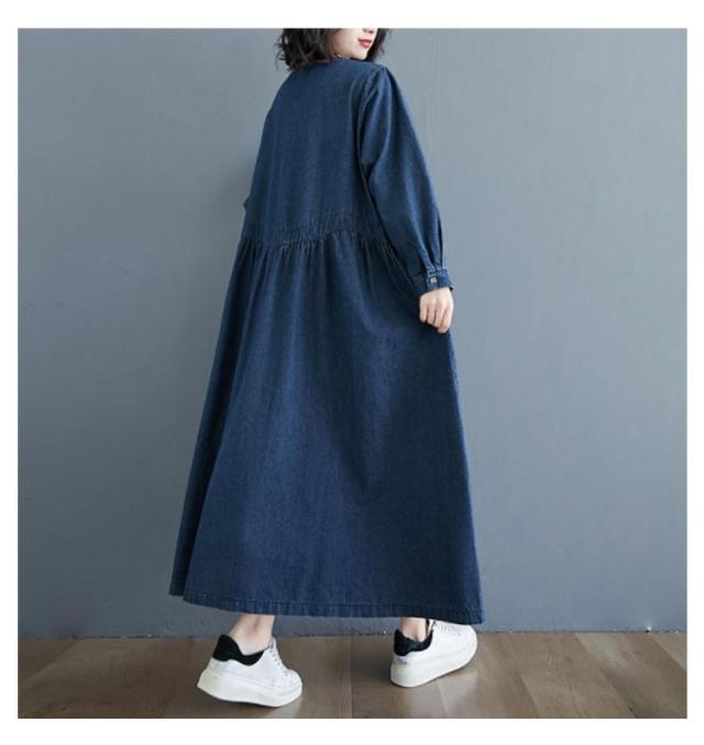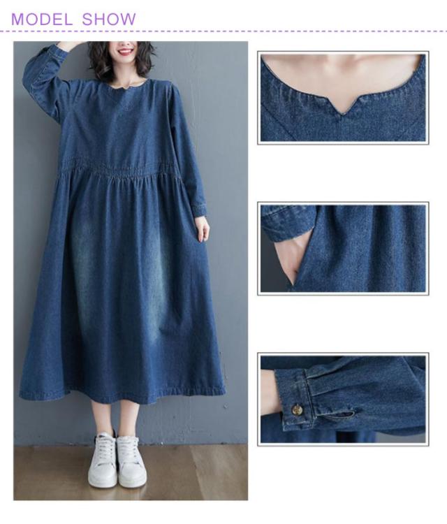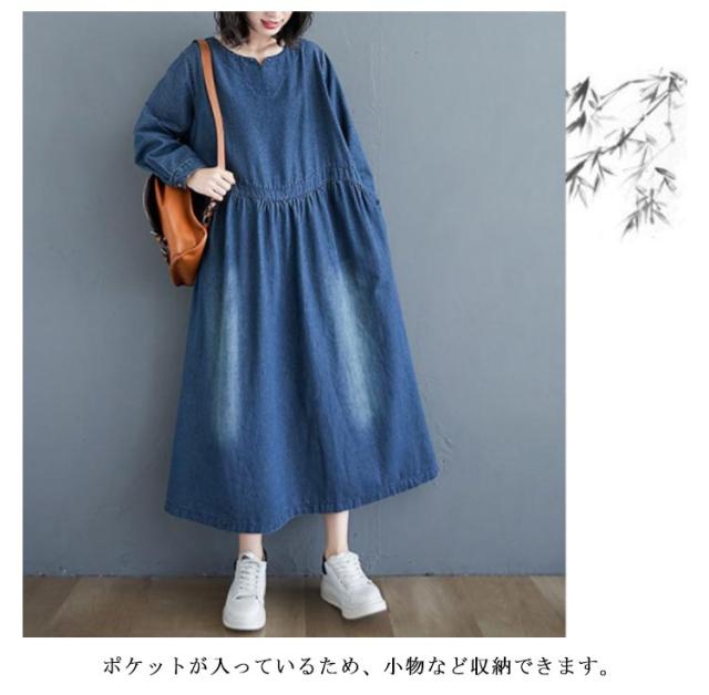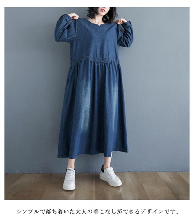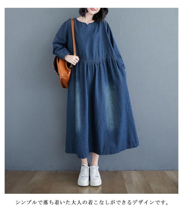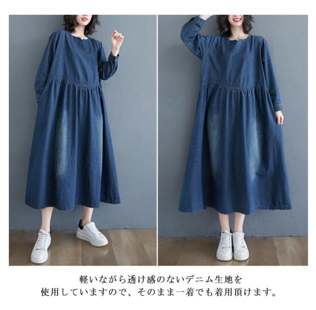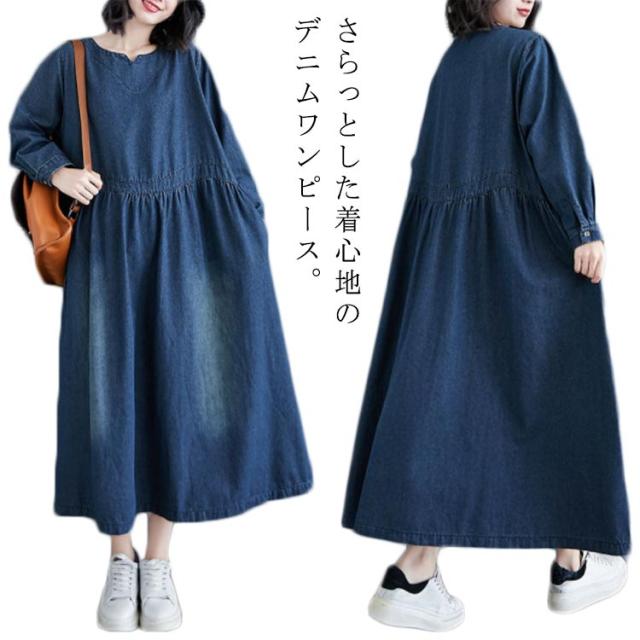 デニムワンピース レディース 春秋 長袖 マキシ ロング丈 ワンピース マキシワンピース ロングワンピース プルオーバー ビッグシルエット 体型カバー マキシワンピー 着痩せ 可愛い ゆったり