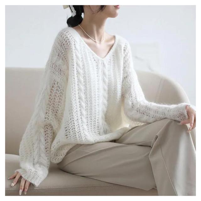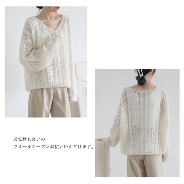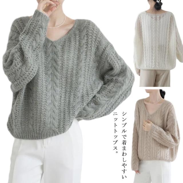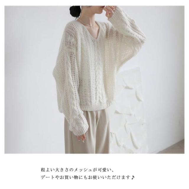 ニット レディース トップス 透かし編み 長袖 春秋 セーター ゆったり Vネック 肌見せ レイヤード シアー 薄手 プルオーバー 体型カバー シンプル カジュアル 通勤 20代 30代 40代 OL ママ 母