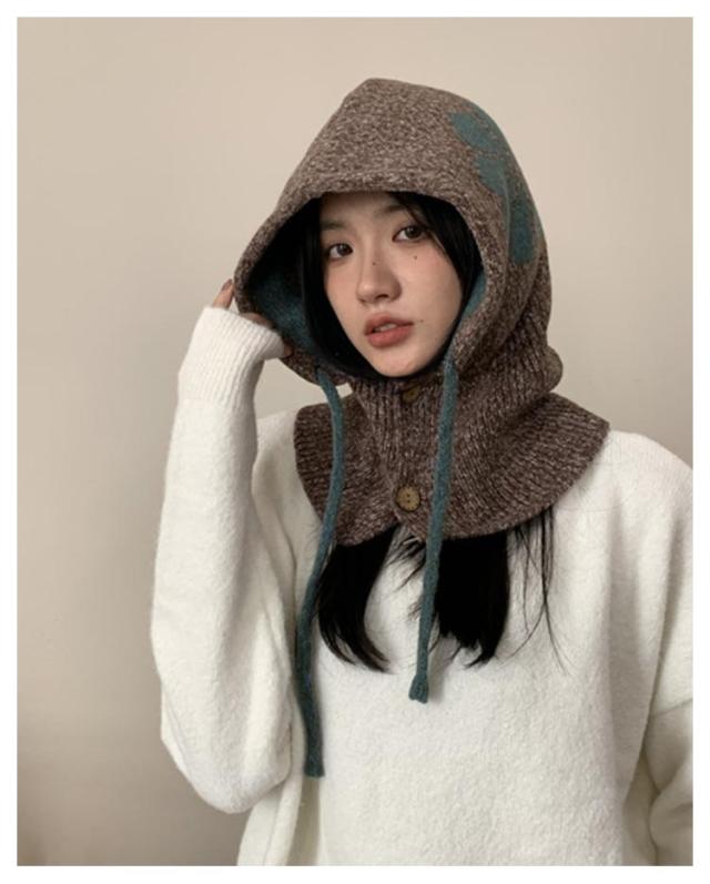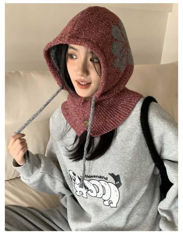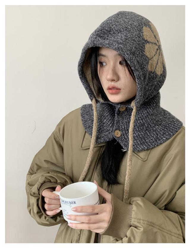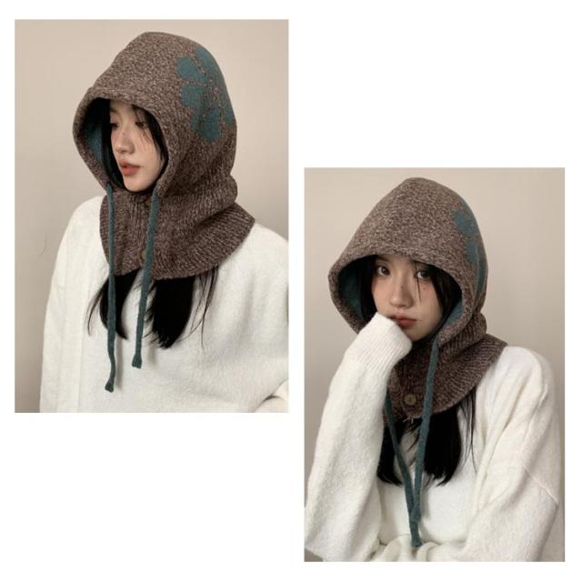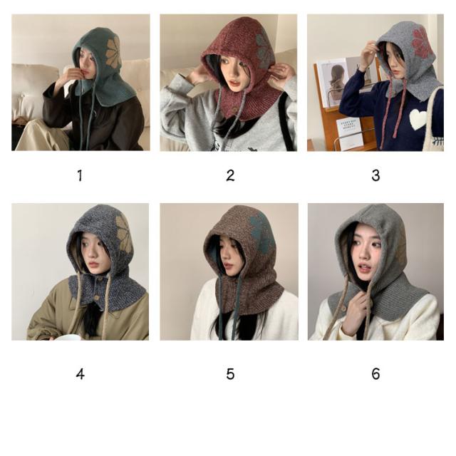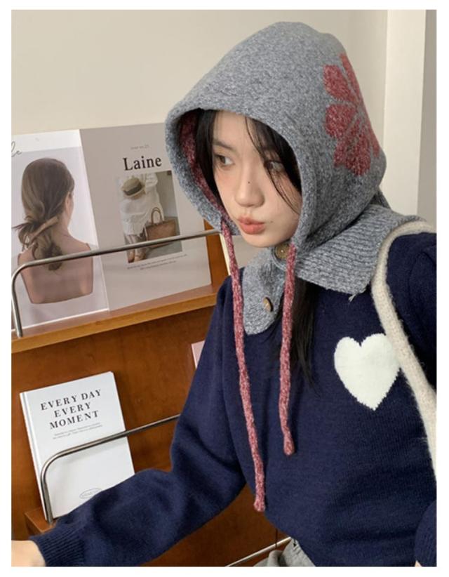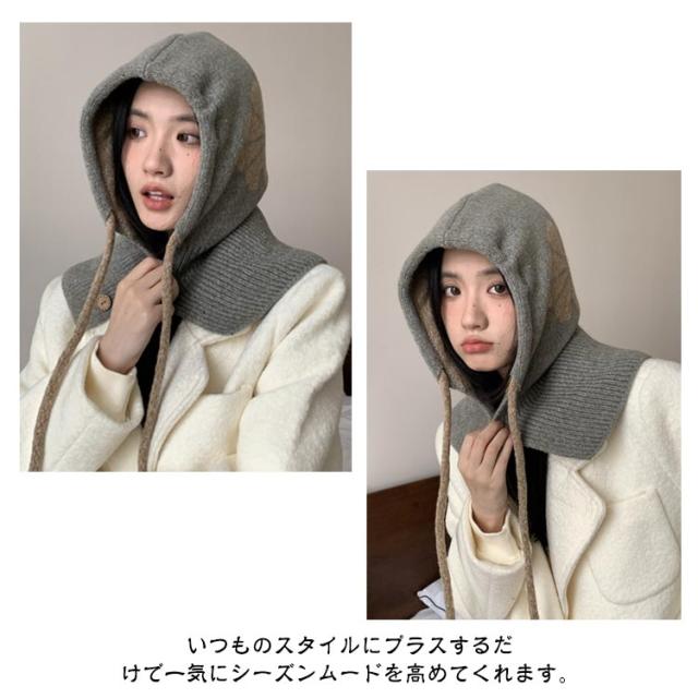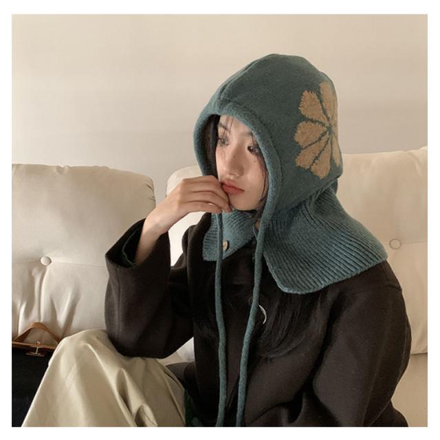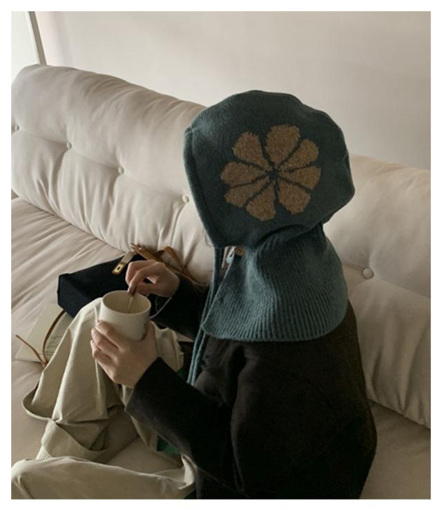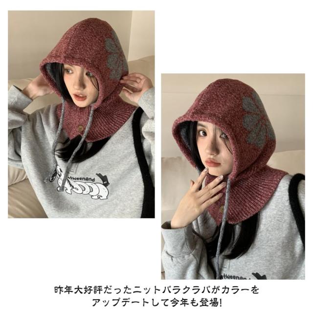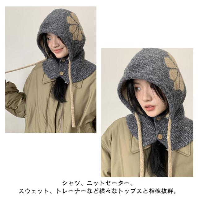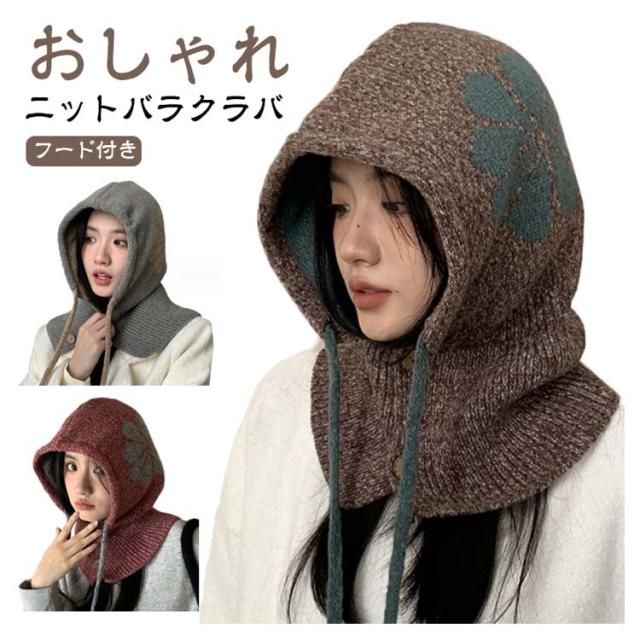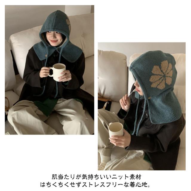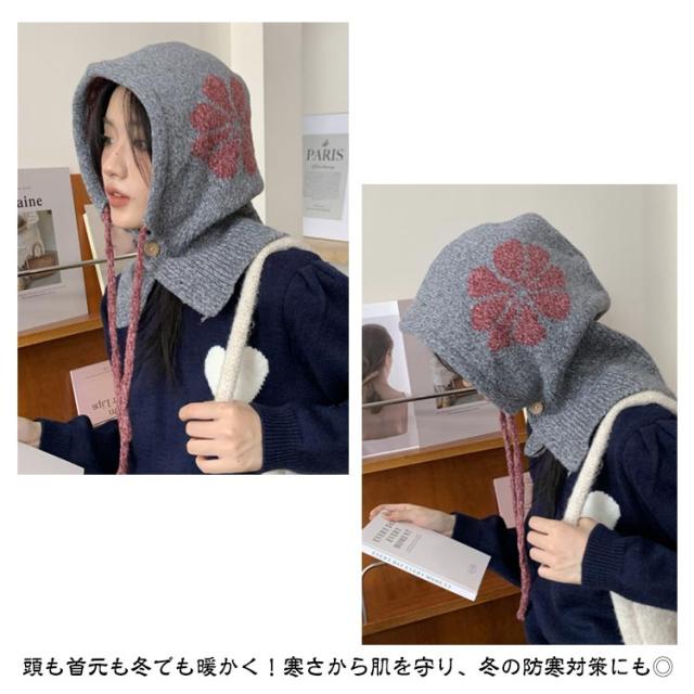 フラワーモチーフ ニットバラクラバ おしゃれ レディース フード付き ネックウォーマー 防寒 ニットフーディー ニット フードウォーマー フード マフラー 帽子 ニットキャップ ニット帽子 バラクラバ 秋冬 付けフード 防寒 スキー 自転車 暖かい あったか 送料無料