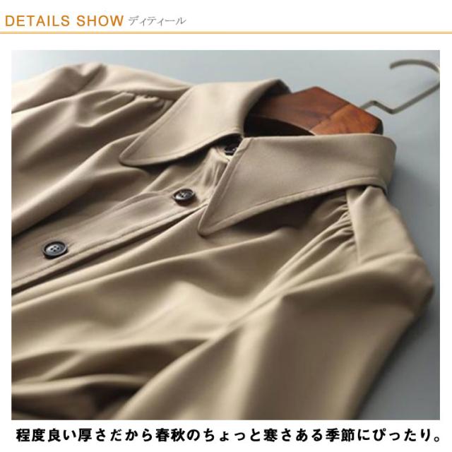 | 今季、大注目の薄手トレンチコート誕生。 ボタン閉めるとワンピースとして、ボタン開くと羽織りとして、幅広く使える。 大人っぽいのに抜け感があって、きれいめにも、カジュアルにも好相性な、使える一着です。 シワになりにくい生地で、さっと着られるのも嬉しいポイント! 程度良い厚さだから春秋のちょっと寒さある季節にぴったり。 タイプだから、いろんな場合に大活躍する間違いなし。 | |