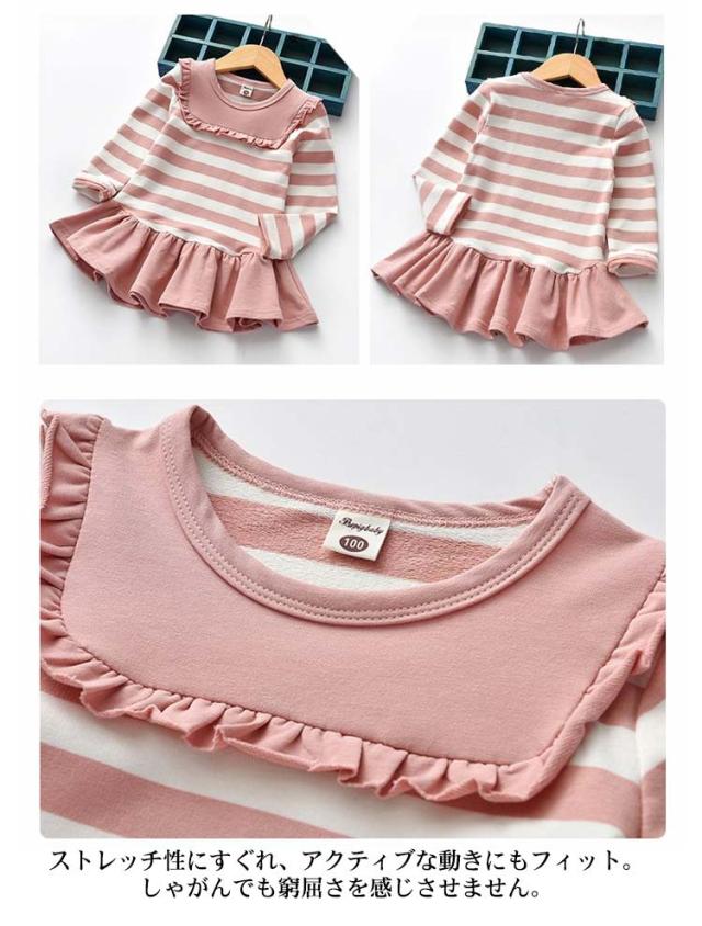 送料無料 パーカーワンピース ミニワンピース 長袖 ミニ丈 ショート丈 子供服 キッズ スウェット ワンピース トレーナー スエット 裾フレア フリル ボーダー柄 シンプル かわいい カジュアル 女の子 女児 子供用 子ども服 こども服
