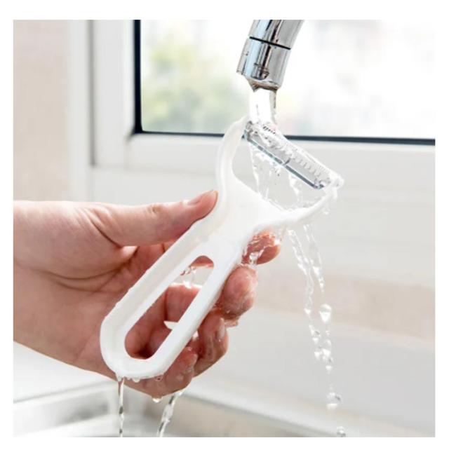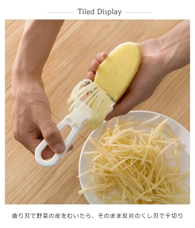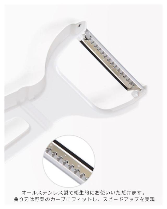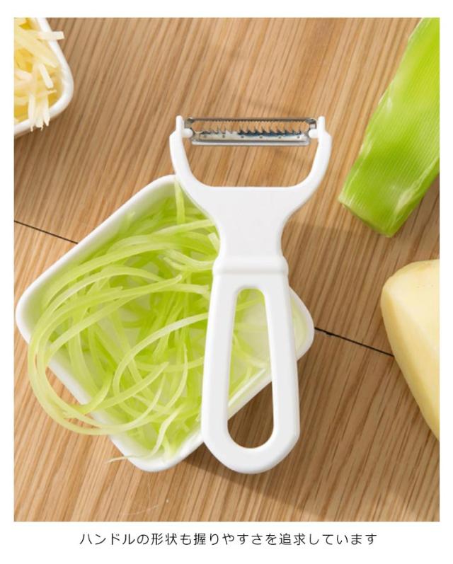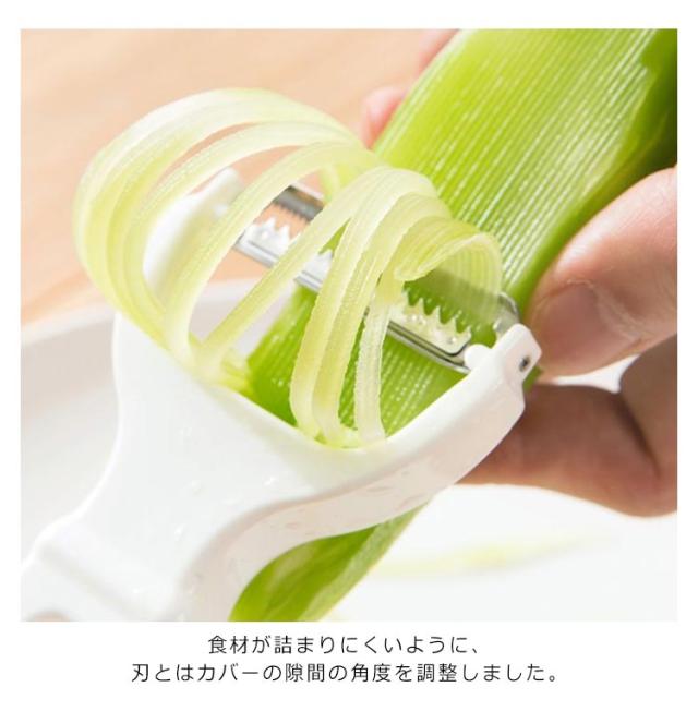 | くし刃1枚1枚に刃付け。スッと引くだけでスムーズに千切りカット 曲り刃で野菜の皮をむいたら、そのまま反対のくし刃で千切り 食材が詰まりにくいように、刃とはカバーの隙間の角度を調整しました。 ハンドルの形状も握りやすさを追求しています オールステンレス製で衛生的にお使いいただけます。曲り刃は野菜のカーブにフィットし、スピードアップを実現 | |