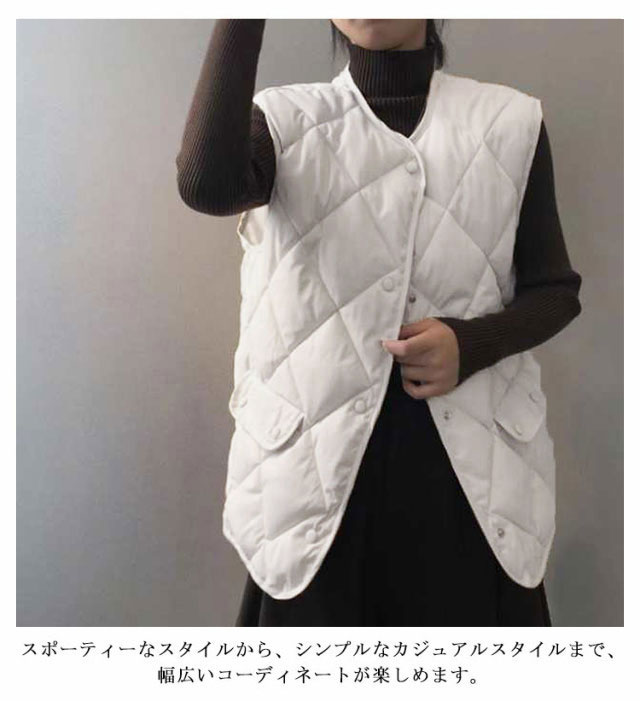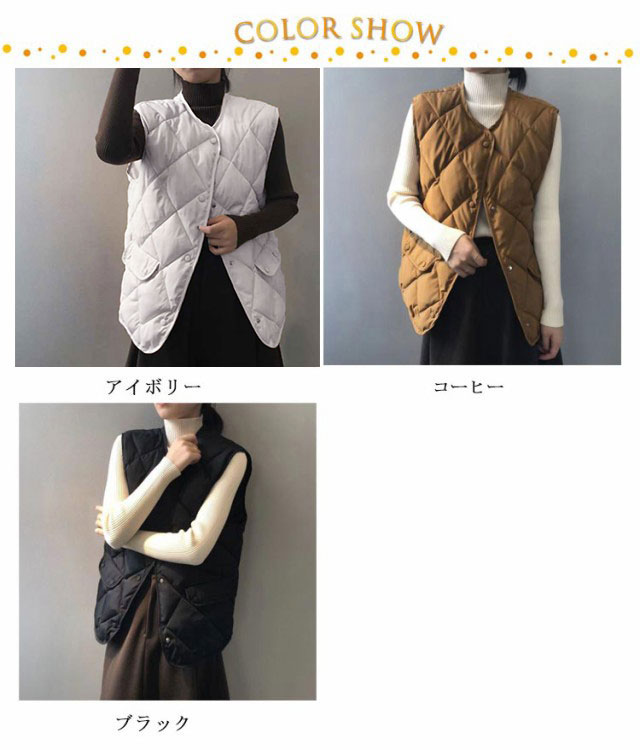 | 全3色×5サイズ!軽くてあたたかい秋冬新作ライトダウン風ベストが入荷。 肌寒い時期のアウターとしてはもちろん、薄手なので冬アウターのインナーにも重ね着OK。 中綿ベストは保温性が高く軽いのに暖かさをしっかりキープしてくれるので秋冬必須の防寒アイテムで。 冷え対策に防寒着としてルームウェアにもおすすめです。 スポーティーなスタイルから、シンプルなカジュアルスタイルまで、幅広いコーディネートが楽しめます。 | |