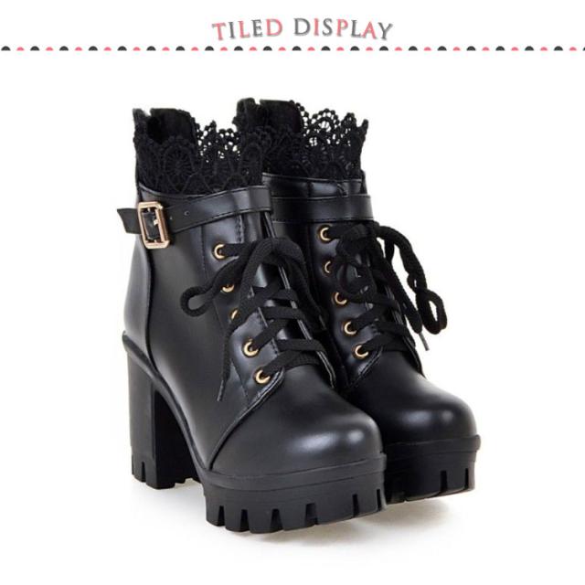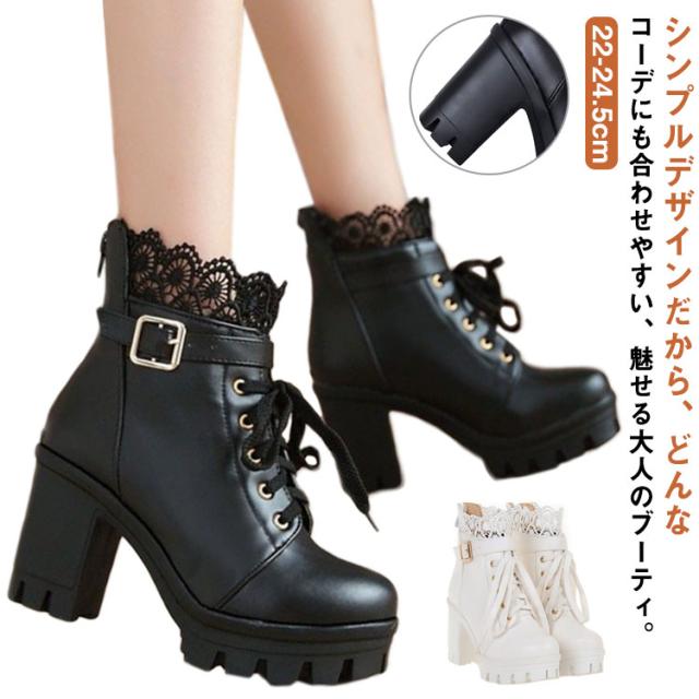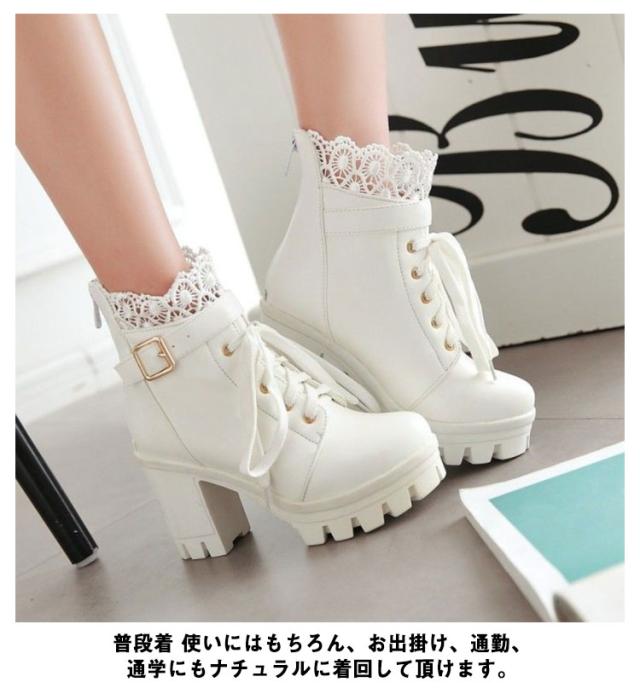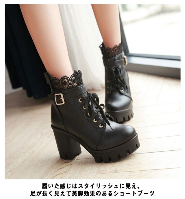 ショートブーツ レディース コスプレシューズ レース付き 黒 白 PU ショート丈 ハイヒール レースアップブーツ おしゃれ 無地 歩きやすい 通勤 通学 大きいサイズ 送料無料