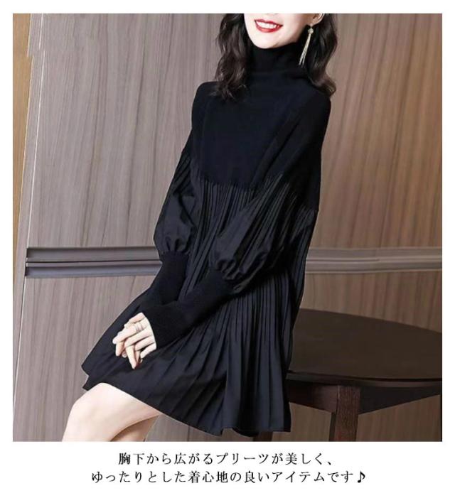 プルオーバー セーター レディース 秋冬 異素材 切替 ハイネック ニット プリーツ プルオーバー ゆったり 体型カバー フレア チュニック ドッキング ゆったり トップス 長袖 パフ袖 ボリュームスリーブ バルーンスリーブ ドロップショルダー 送料無料