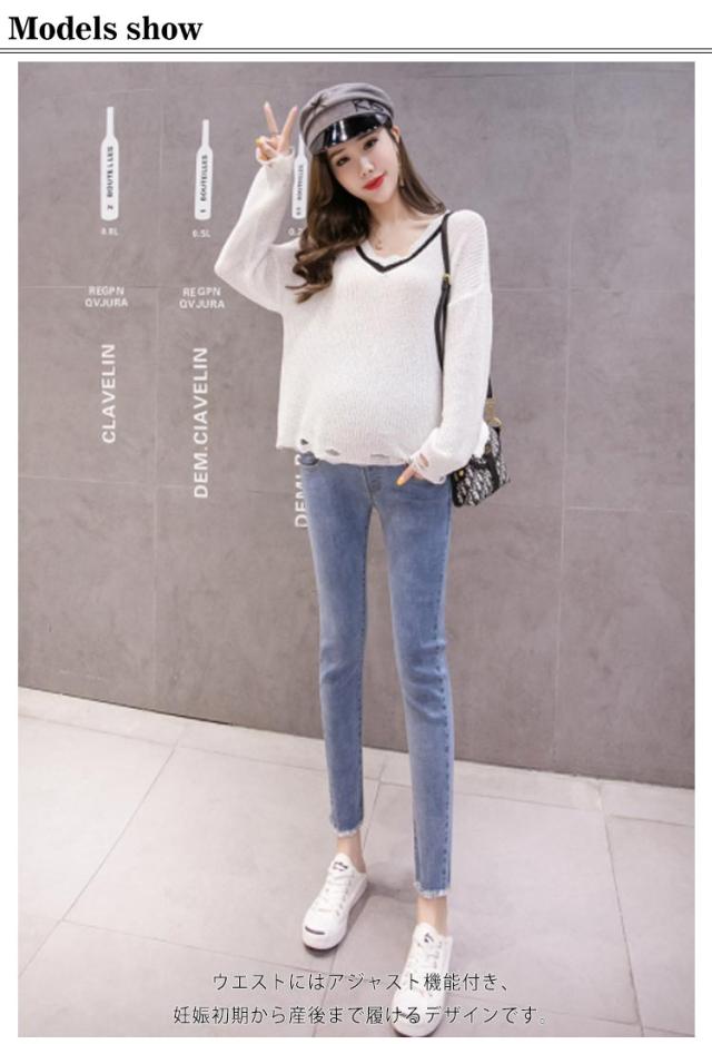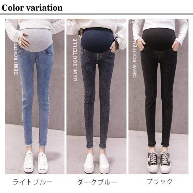 | 妊娠中でなくても、普段から使えるストレッチ性のあるデニムパンツ。 ウエストにはアジャスト機能付き、妊娠初期から産後まで履けるデザインです。 フリンジ加工の裾で、カジュアルな中にも「こなれた抜け感」を演出してくれます。 伸縮性のあるデニム素材を使用、動きやすくフィット感も抜群、美脚効果も◎ 毎日のコーデとも合わせやすく1枚持っているととっても便利なアイテムです。 | |