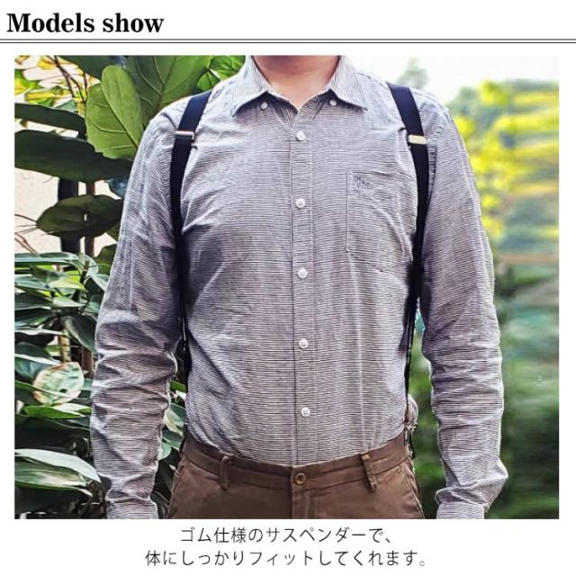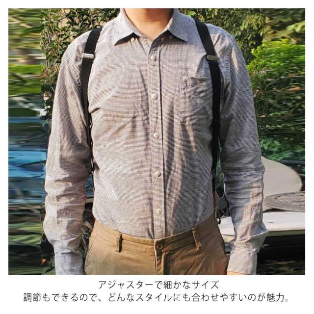 | スタイリッシュなデザインで、ホルスターのようなメンズ用サスペンダー。 ゴム仕様のサスペンダーで、体にしっかりフィットしてくれます。 体の後ろでクロスしているので、体の動きにぴったりフィット! クロス部分はフェイクレザーを使用し、色落ちを防止することができます。 アジャスターで細かなサイズ調節もできるので、どんなスタイルにも合わせやすいのが魅力。 | |