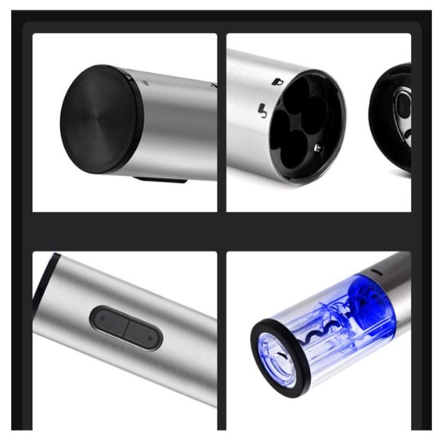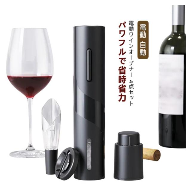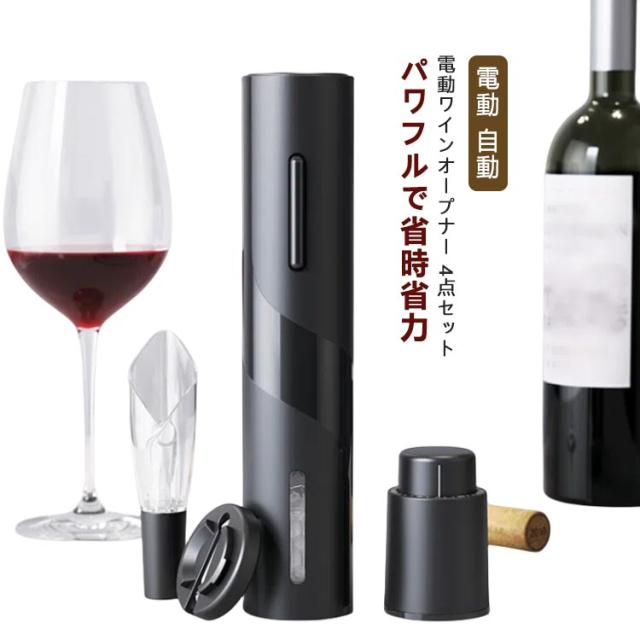 4点セット ワインオープナー 電動 自動 栓抜き 電動ワインオープナー 電池式 コードレス 単3形乾電池 栓 ワイン コルク抜き 栓抜き 自動開栓 省時 省力 操作簡単 軽量 静音 ポアラー付き 真空ポンプシーラ付き フォイルカッター付き
