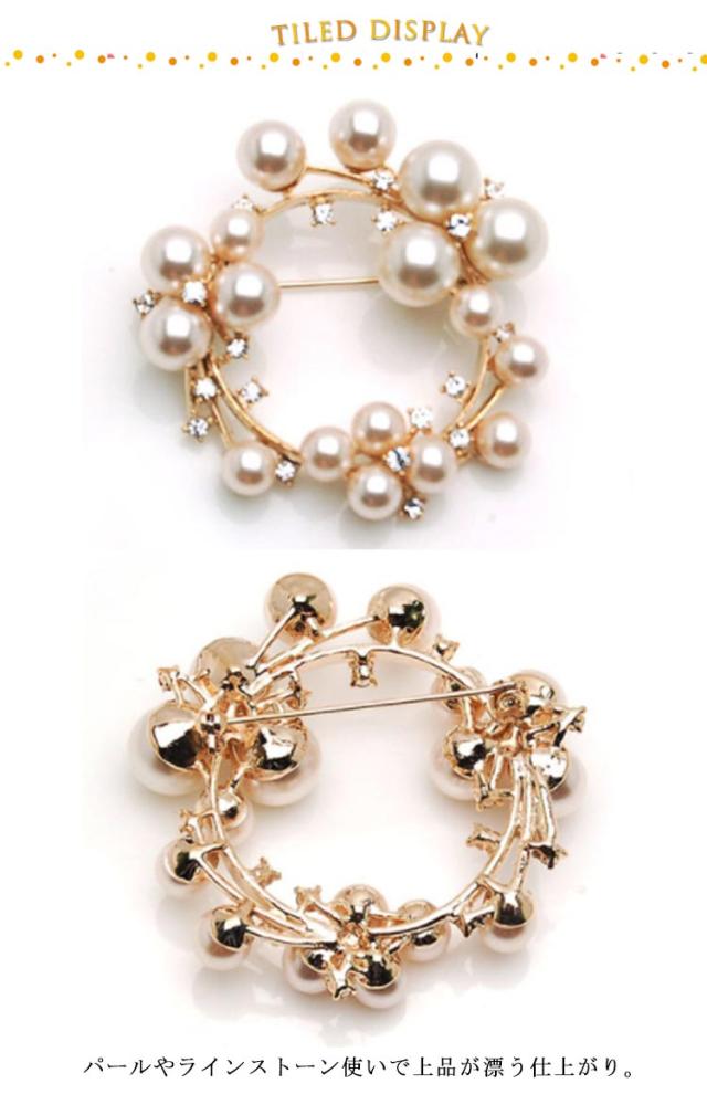 | 華やかでかわいらしいブローチ。 パールやラインストーン使いで上品が漂う仕上がり。 入学式や卒業式などのフォーマルの装いにぴったりのはもちろん、普段の装いも華やかに演出してくれるので、おしゃれ上級者に人気のアイテムです。 胸元のワンポイントとしてだけでなく、マフラーやスカーフ留めとしても活躍できます。 | |