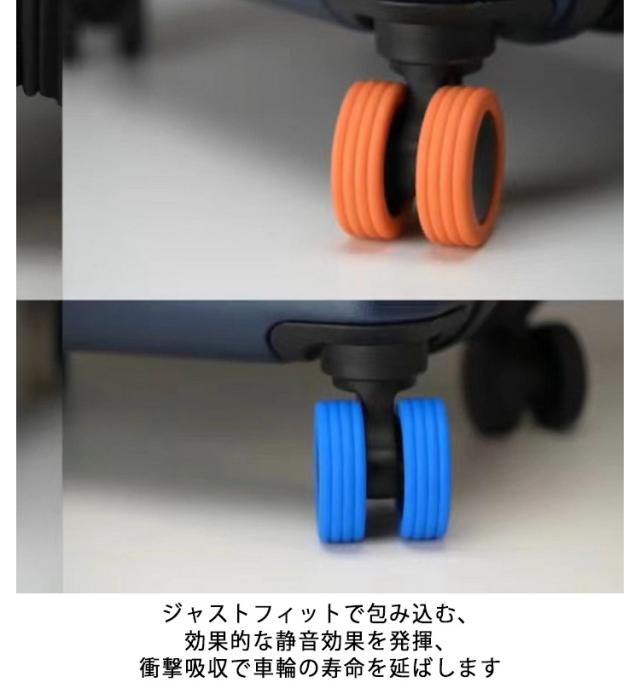 | スーツケースの汚れを室内に持ち込まない車輪カバー ジャストフィットで包み込む、効果的な静音効果を発揮、衝撃吸収で車輪の寿命を延ばします 耐摩耗性を補強 滑り止め・床を保護する役割を果たし、車輪が床を傷つけずに騒音を軽減します | |