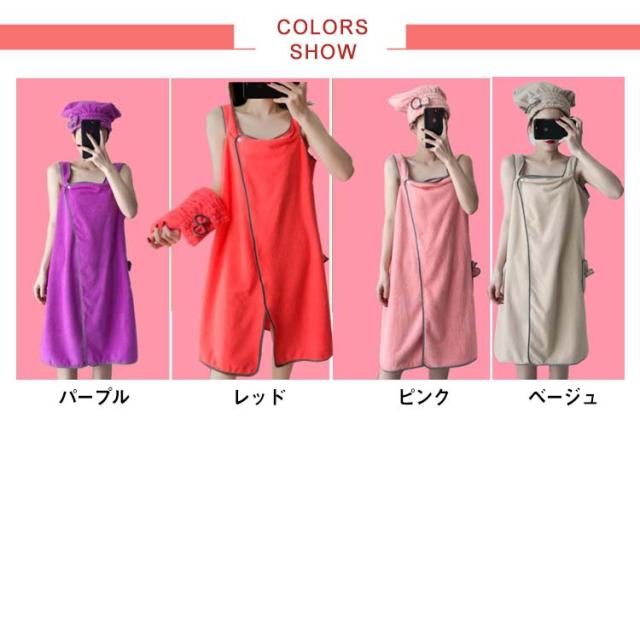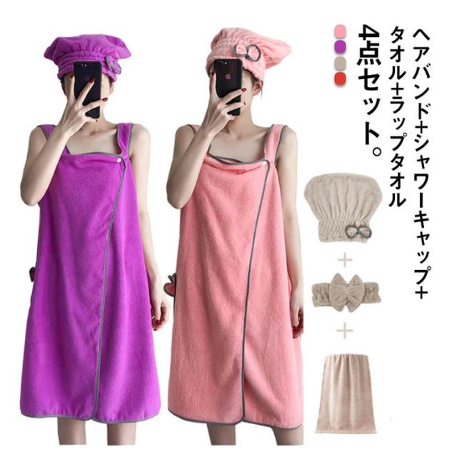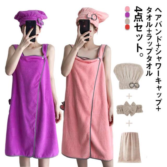 ラップタオル 大人用 バスタオル ワンピース 巻きタオル タオル バスローブ パイル レディース 4点セット ヘアバンド シャワーキャップ 夏用 風呂上がり 風呂 プール ルームウェア プールタオル 無地 シンプル 軽量 速乾 吸水 タオルドレス スカートタオル 可愛い