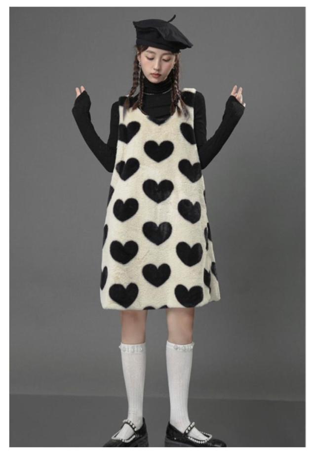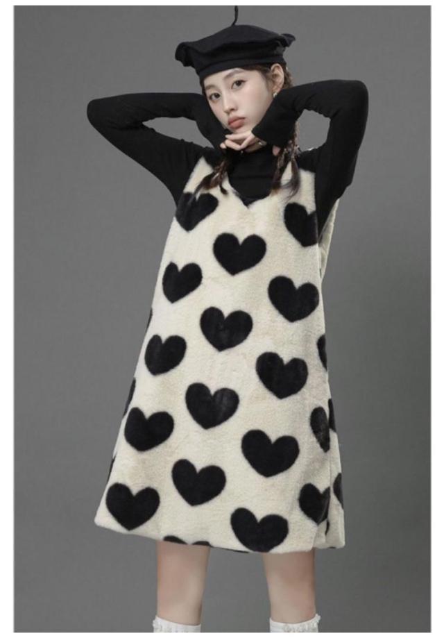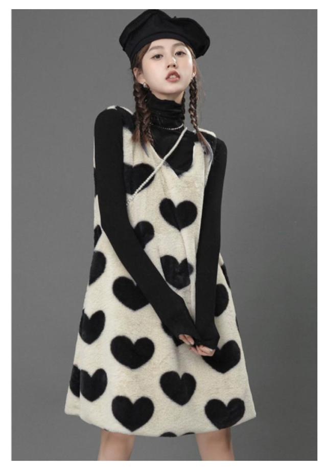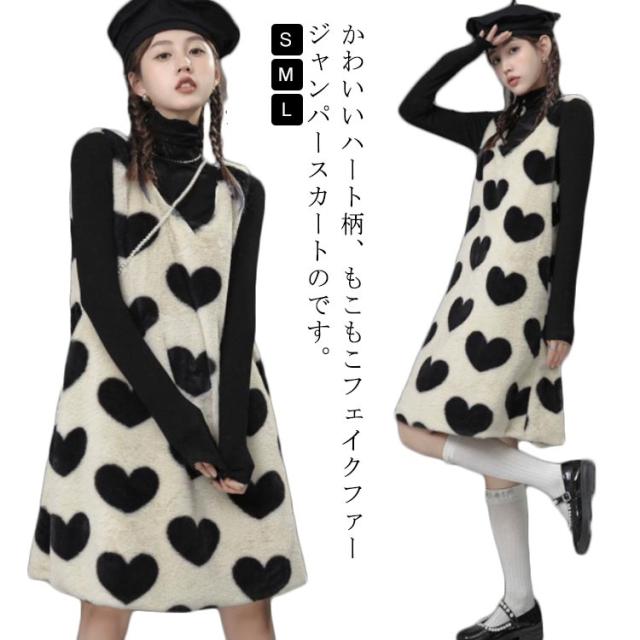 フェイクファー ジャンパースカート 秋冬 中綿入り ハート柄 Vネック ワンピース ノースリーブ レディース ジャンスカ あったか 韓国ファッション S M L