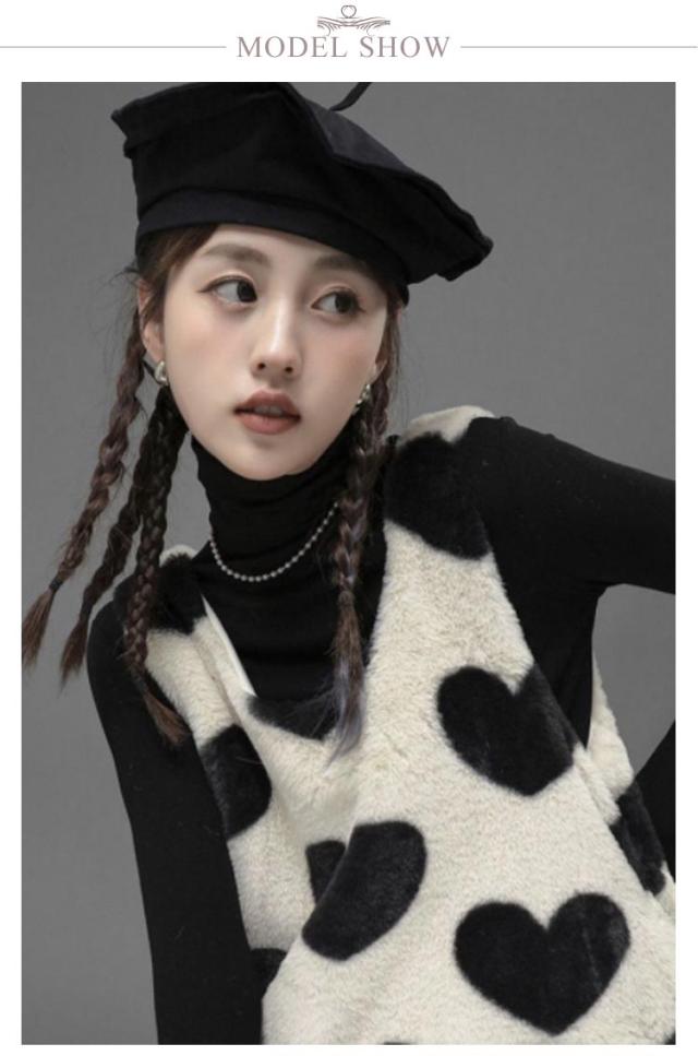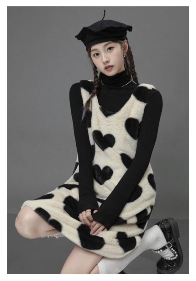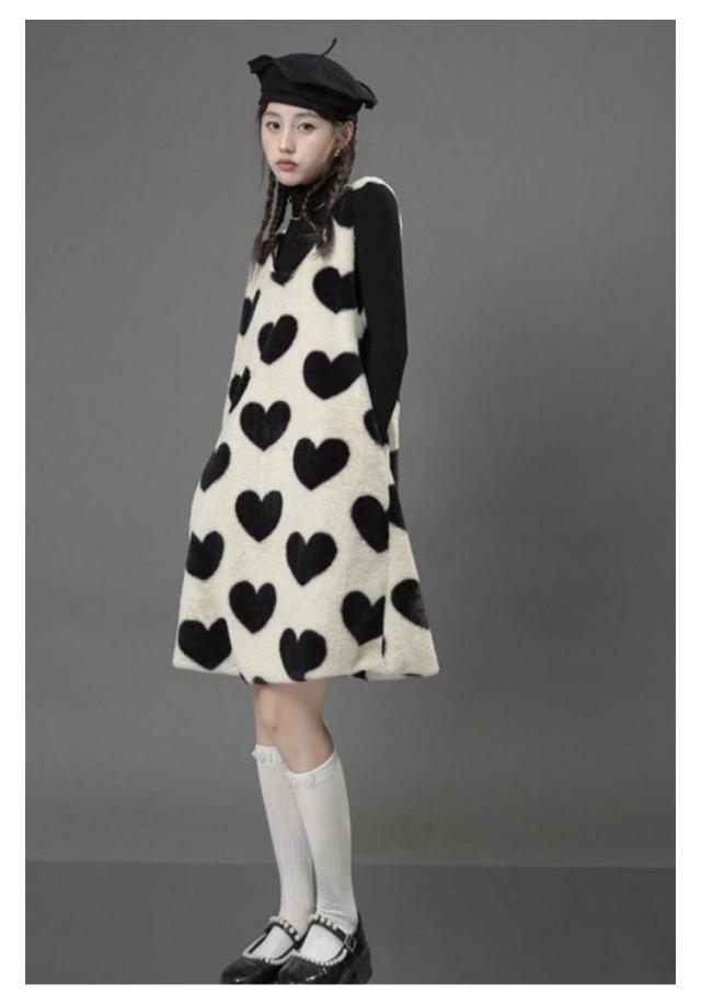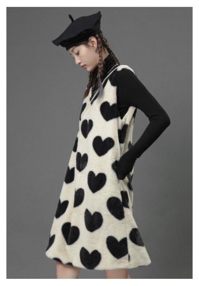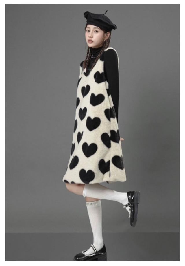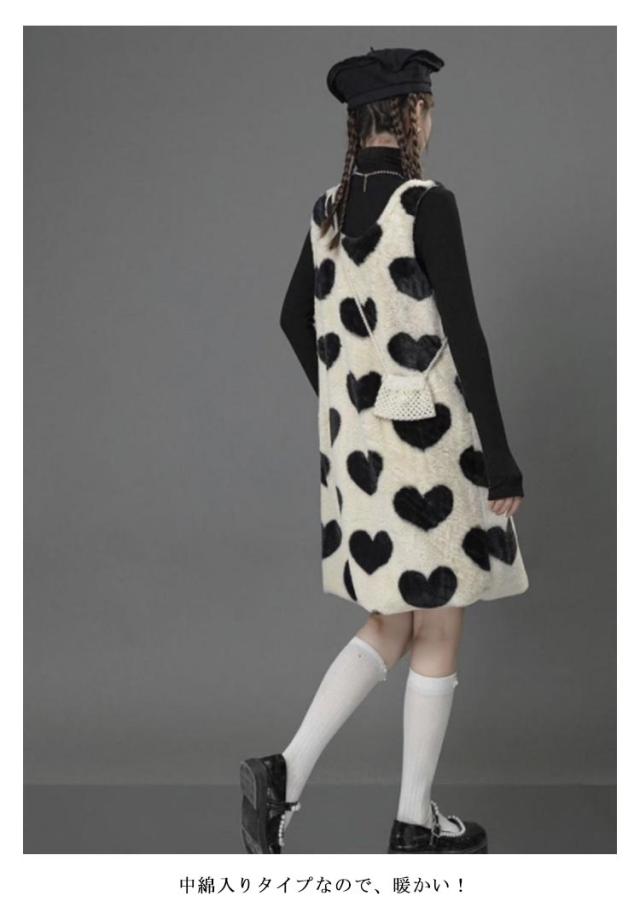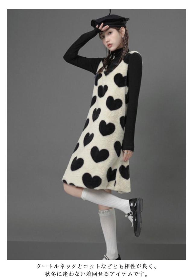 | かわいいハート柄、もこもこフェイクファージャンパースカートのです。 中綿入りタイプなので、暖かい! タートルネックとニットなどとも相性が良く、秋冬に迷わない着回せるアイテムです。 | |