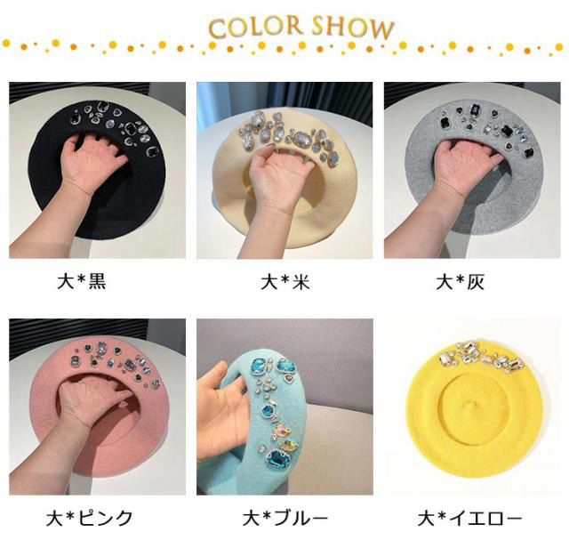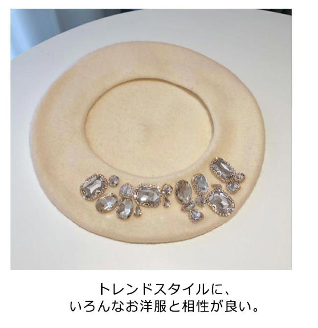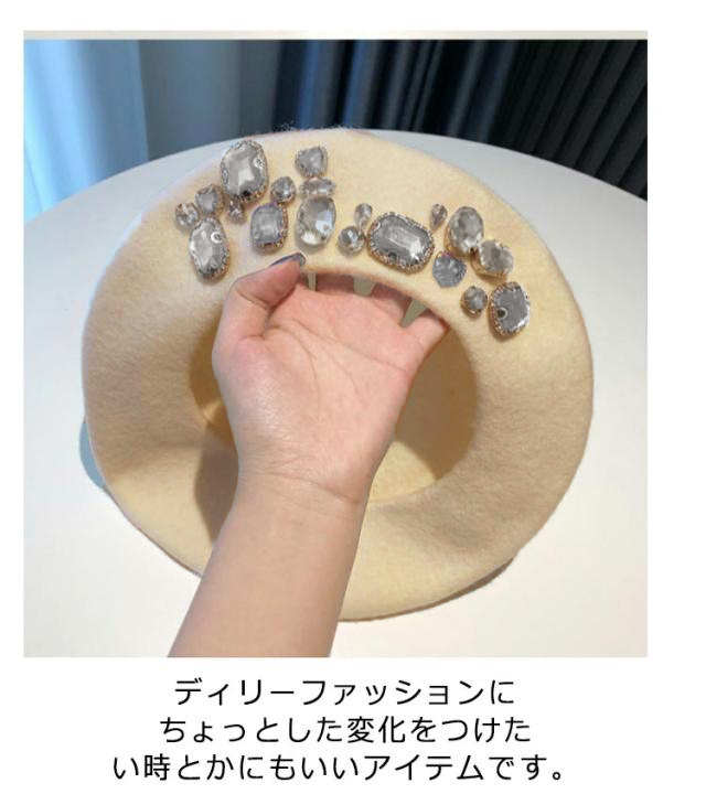 | ジュエリー付き、華やかなベレー帽。 ダイヤとパール2タイプあり、視覚的に小顔に見えデザイン。 トレンドスタイルに、いろんなお洋服と相性が良い。 ディリーファッションにちょっとした変化をつけたい時とかにもいいアイテムです。 | |