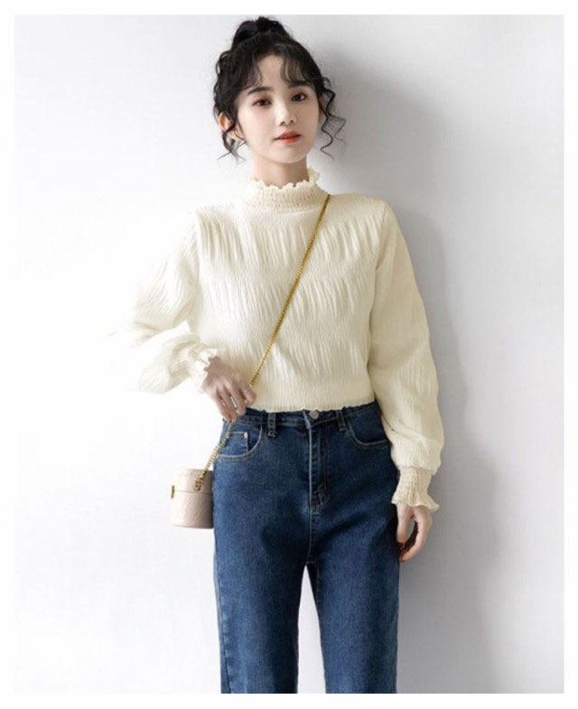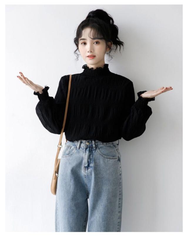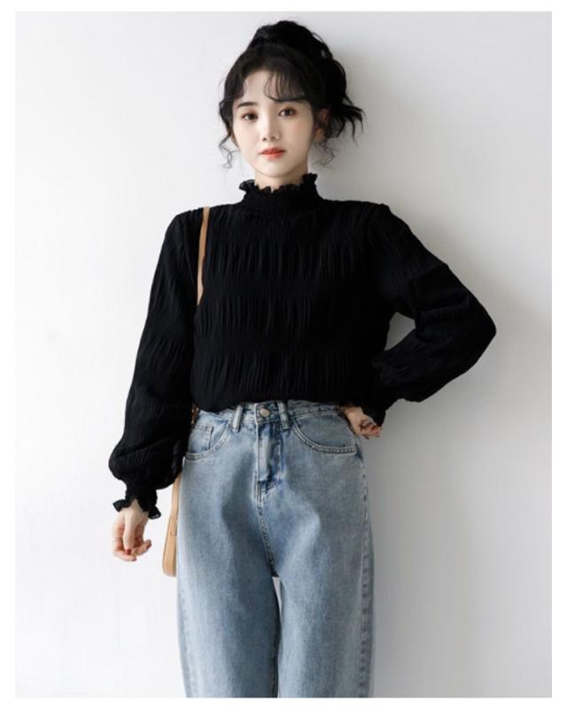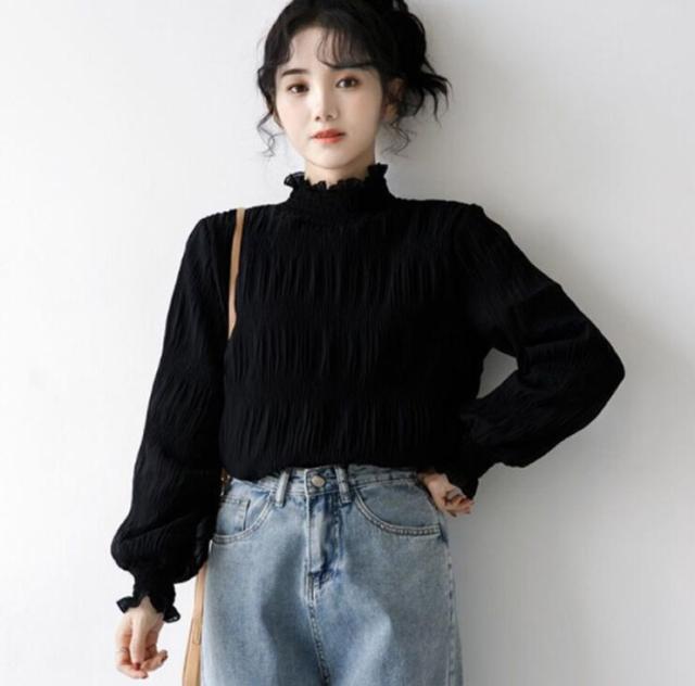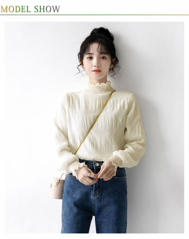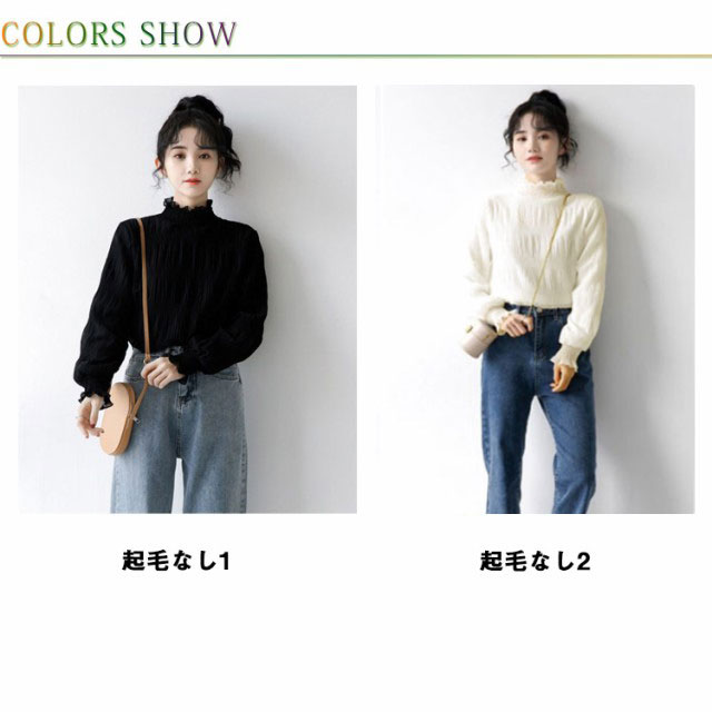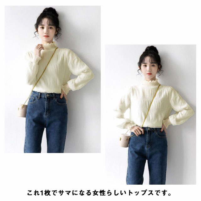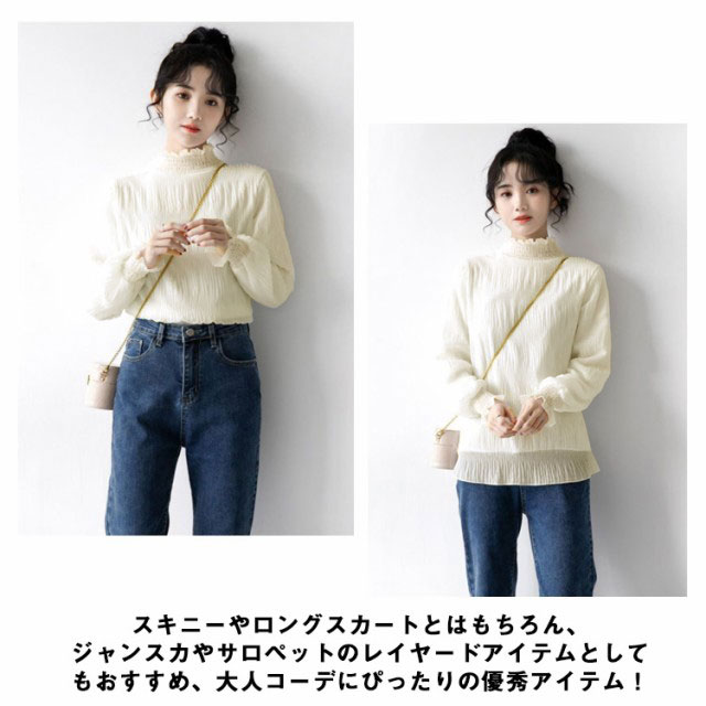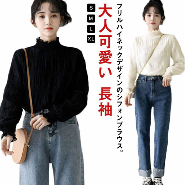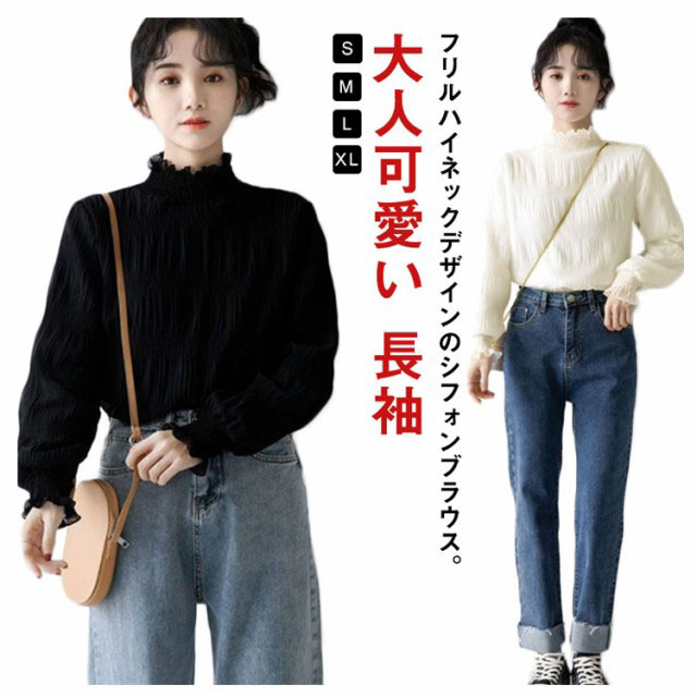 シフォン ブラウス レディース シャーリング ハイネック ギャザー 春 シャツ 長袖 トップス レイヤード キャンディースリーブ フリル袖 ふんわり 大人可愛い S M L XL