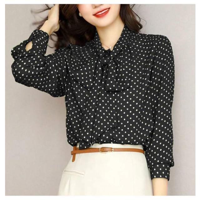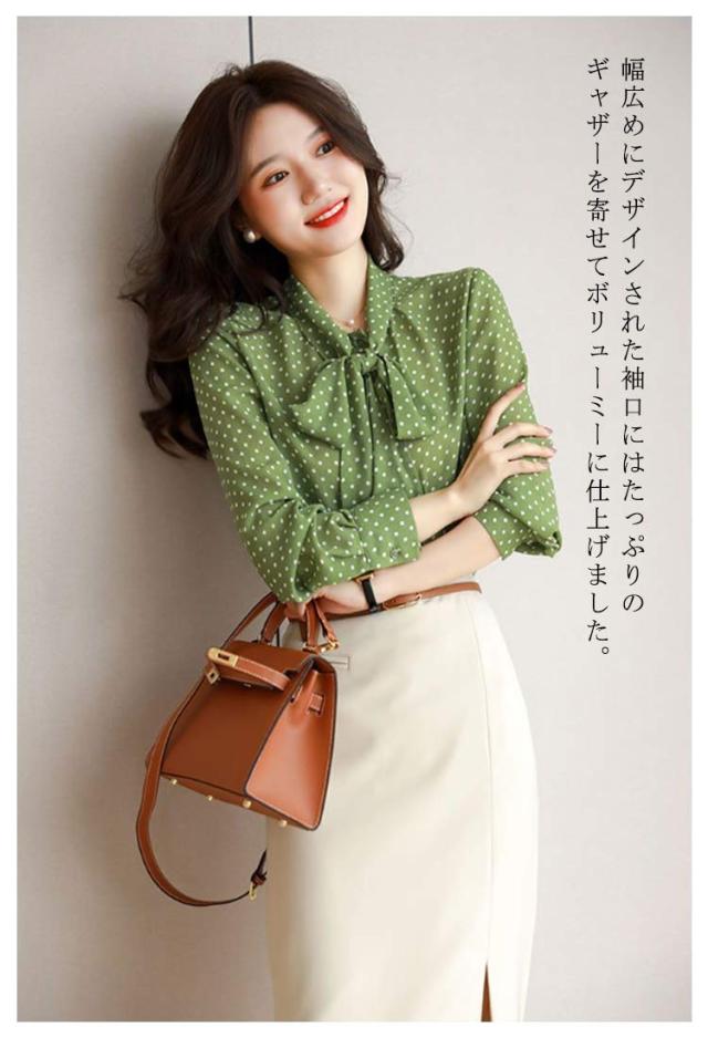 送料無料 ボウタイブラウス トップス ブラウス 長袖 ボータイ リボン 水玉 ドット リボンタイ 襟付き シフォン ブラウス シャツ ボウタイリボン パフスリーブ オフィス フェミニン レディース 春 ボウタイブラウス フォーマル