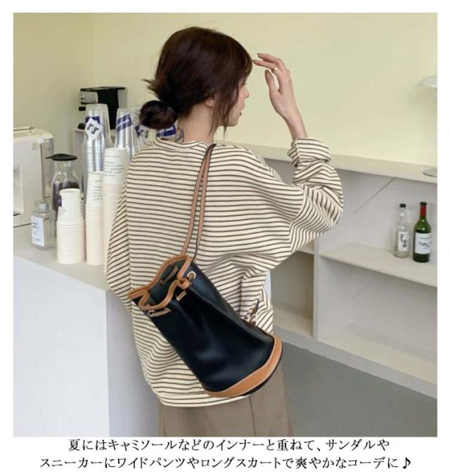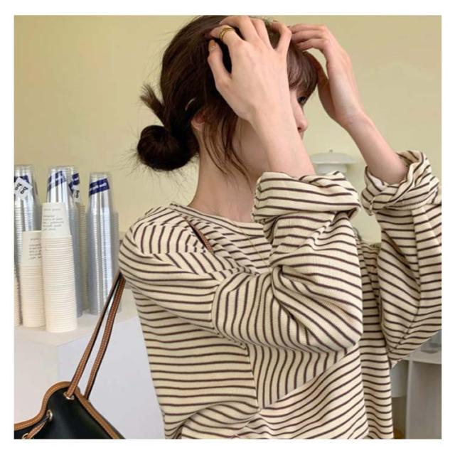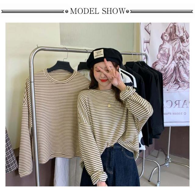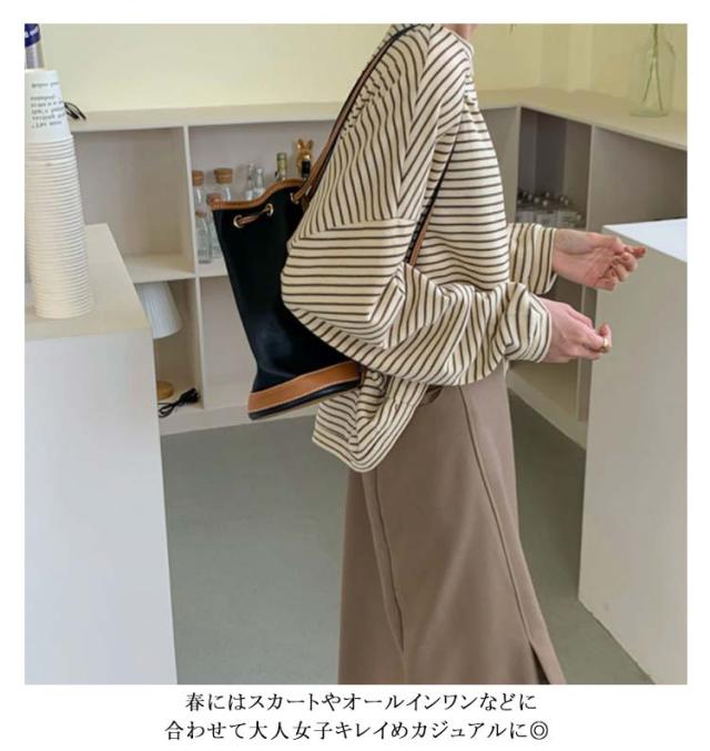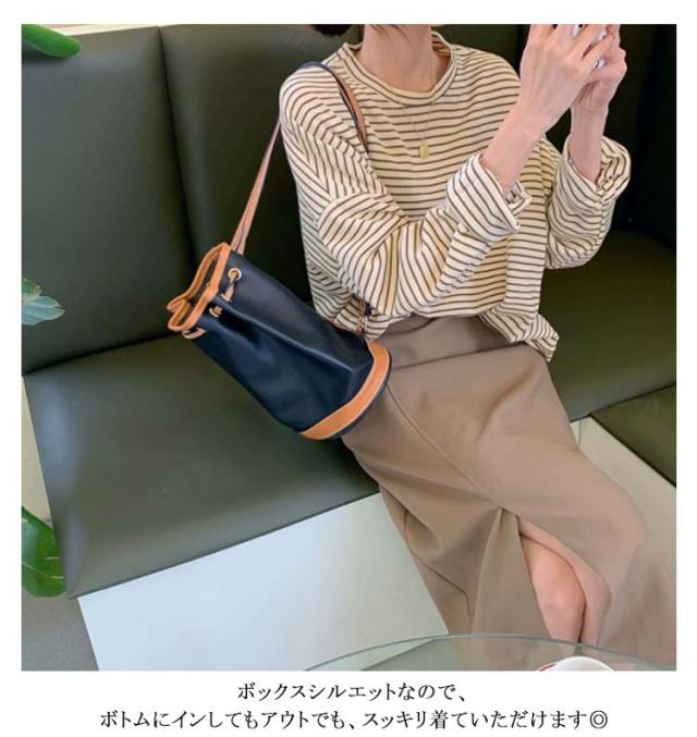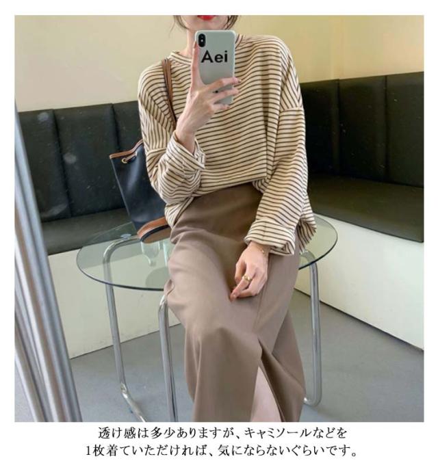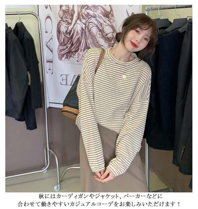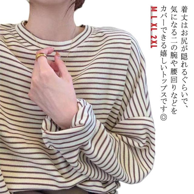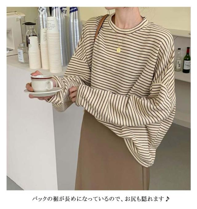 ボーダーロングTシャツ ボーダー ロング カットソー プルオーバー 長袖 クルーネック レディース Uネック カジュアル 可愛い シンプル 韓国ファッション トップス ゆったり ストラップ インナー 春 秋 ルームウエア 20代 30代 M-2XL 送料無料