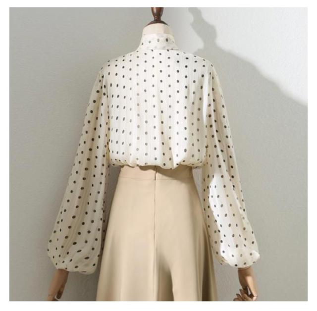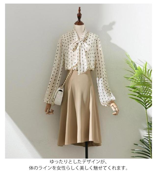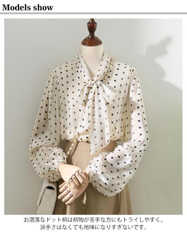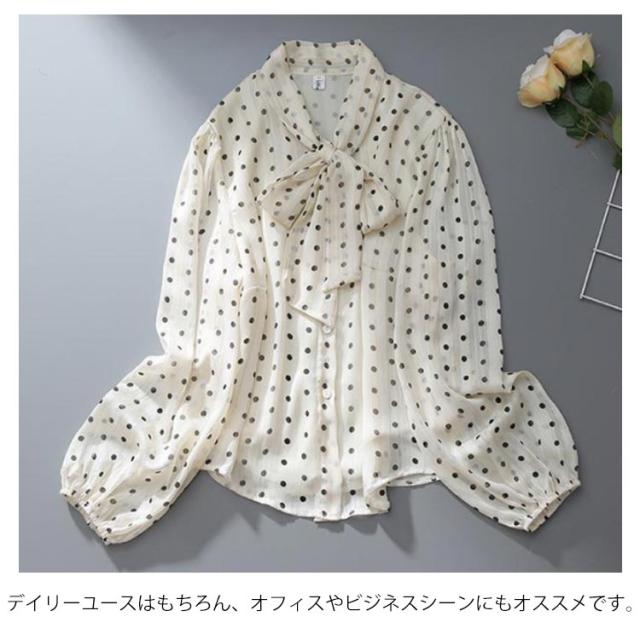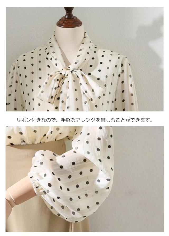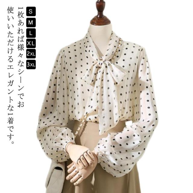 ブラウス レディース リポン付き シャツ ドット柄 パフスリーブ 長袖 きれいめ トップス 通勤 OL ゆったり 大きいサイズ お洒落 可愛い フォーマル 上品 送料無料