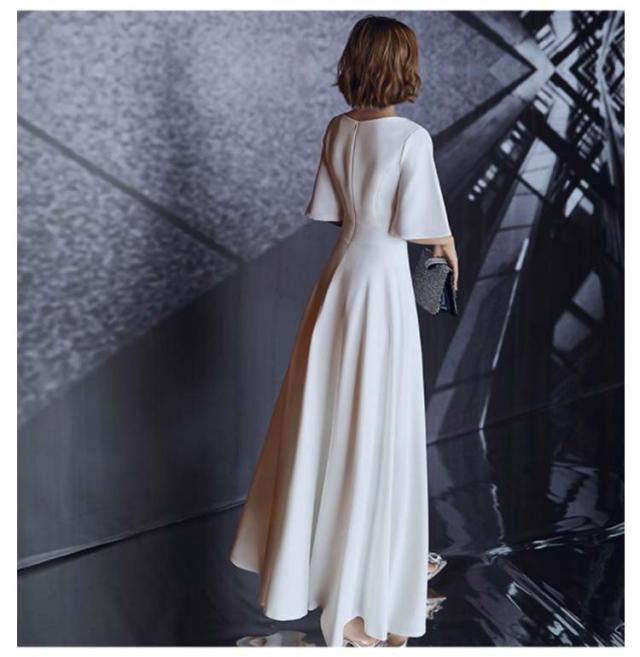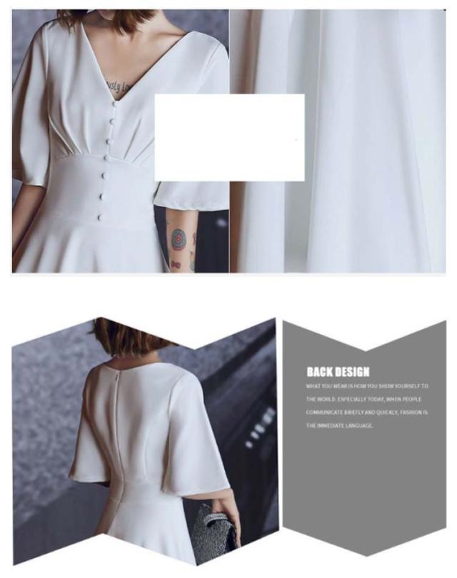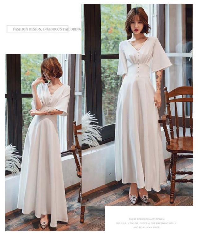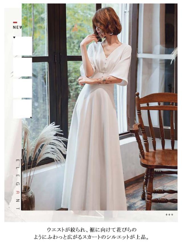 ウェディングドレス ワンピース Vネック 5分袖 Aライン ロング丈 フレアドレス 花嫁ドレス 後ろファスナー 体型カバー 結婚式 二次会 海外挙式 前撮り 後撮り 大きいサイズ ホワイト