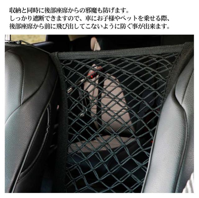 | 車内の空間を有効利用できる飛び出し防止ネットです。 後部座席から身を乗り出すお子様やペットを守るための必需品! 二つのポケット付き、収納力抜群で車の中に散らばりがちな小物をまとめて楽に収納可能。 カバン、携帯、iPad、ティッシュ、傘、手帳、雑誌、本等。 ネット仕様でアイテムが分かりやすくほしい物をサッと取り出すことが出来ます。 収納と同時に後部座席からの邪魔も防げます。 しっかり遮断できますので、車にお子様やペットを乗せる際、後部座席から前に飛び出してこないように防ぐ事が出来ます。 高品質の厚みあるのメッシュを採用して、弾力性・伸縮可能なので、 運転席と助手席の間のスペースに応じて最適なサイズに調整できます。 フックで引っ掛けるだけの簡単取付、引っ掛ける場所があればどこでも対応可能です! 車のみならず、アウトドア用品やDIY用品としても使用いただけます。 アイデア次第で様々なシーンで活用可能です。 | |