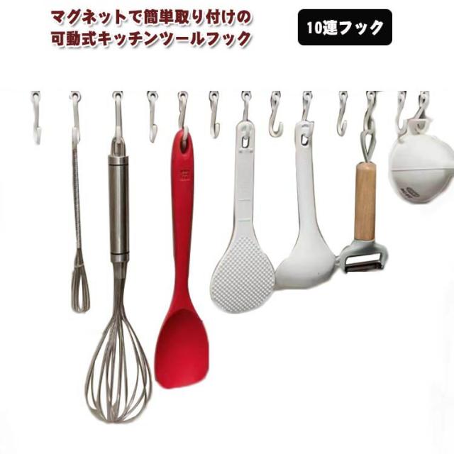 フック マグネット可動式キッチンツールフック タワー キッチンツールフック キッチン 10連フック キッチン ツール 吊り フック 調理道具 収納 台所 吸盤 強力 ステンレス スライド フック 掛けやすい 吊下げ 壁面収納 キッチン 収納 吊り下げ