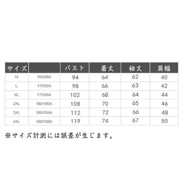 | サイズについての説明 | M バスト94 着丈64 袖丈62 肩幅40 L バスト98 着丈66 袖丈63 肩幅42 XL バスト102 着丈68 袖丈64 肩幅44 2XL バスト108 着丈70 袖丈65 肩幅46 3XL バスト112 着丈72 袖丈66 肩幅48 4XL バスト119 着丈74 袖丈67 肩幅50 ※サイズ計測には誤差が生じます。 |